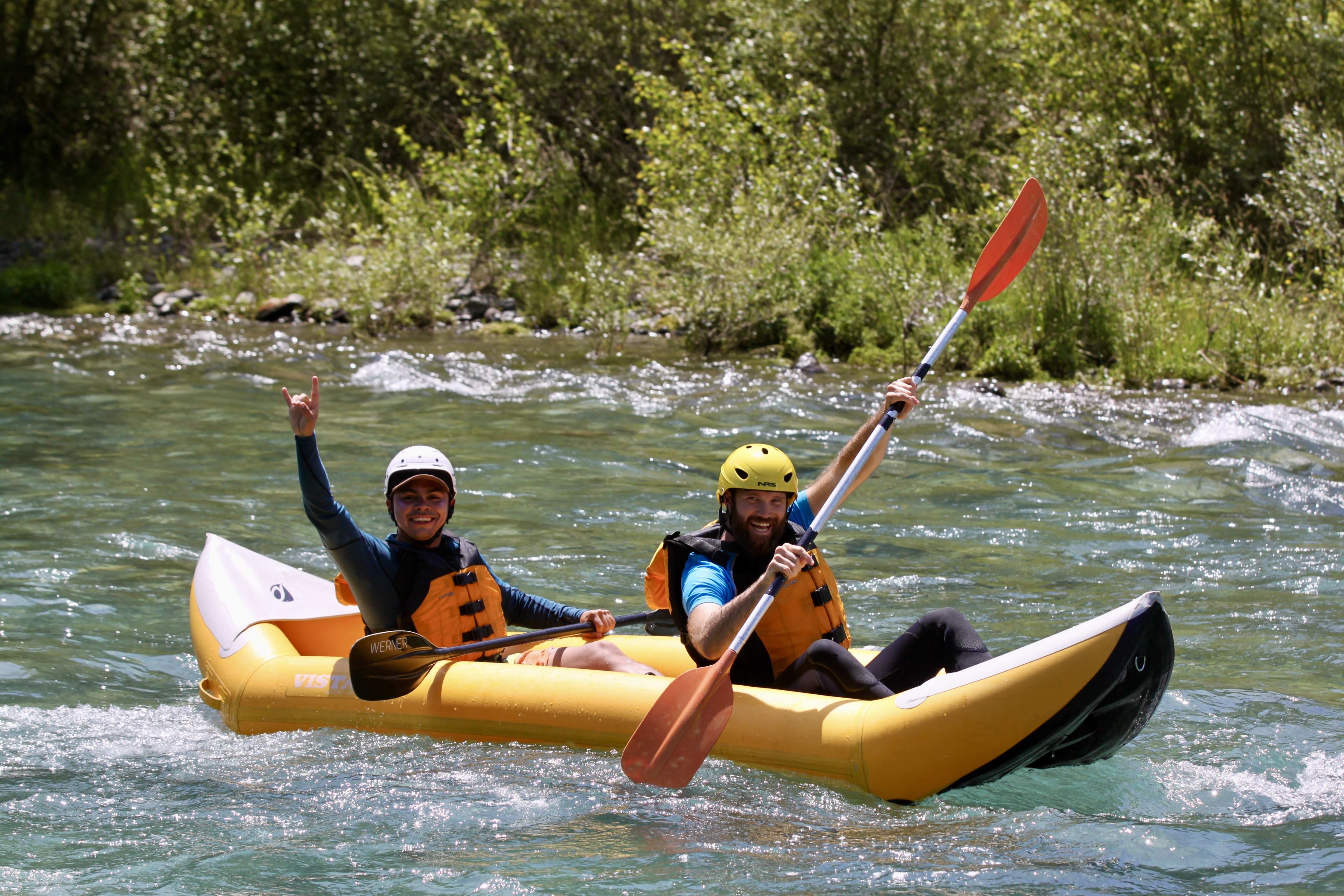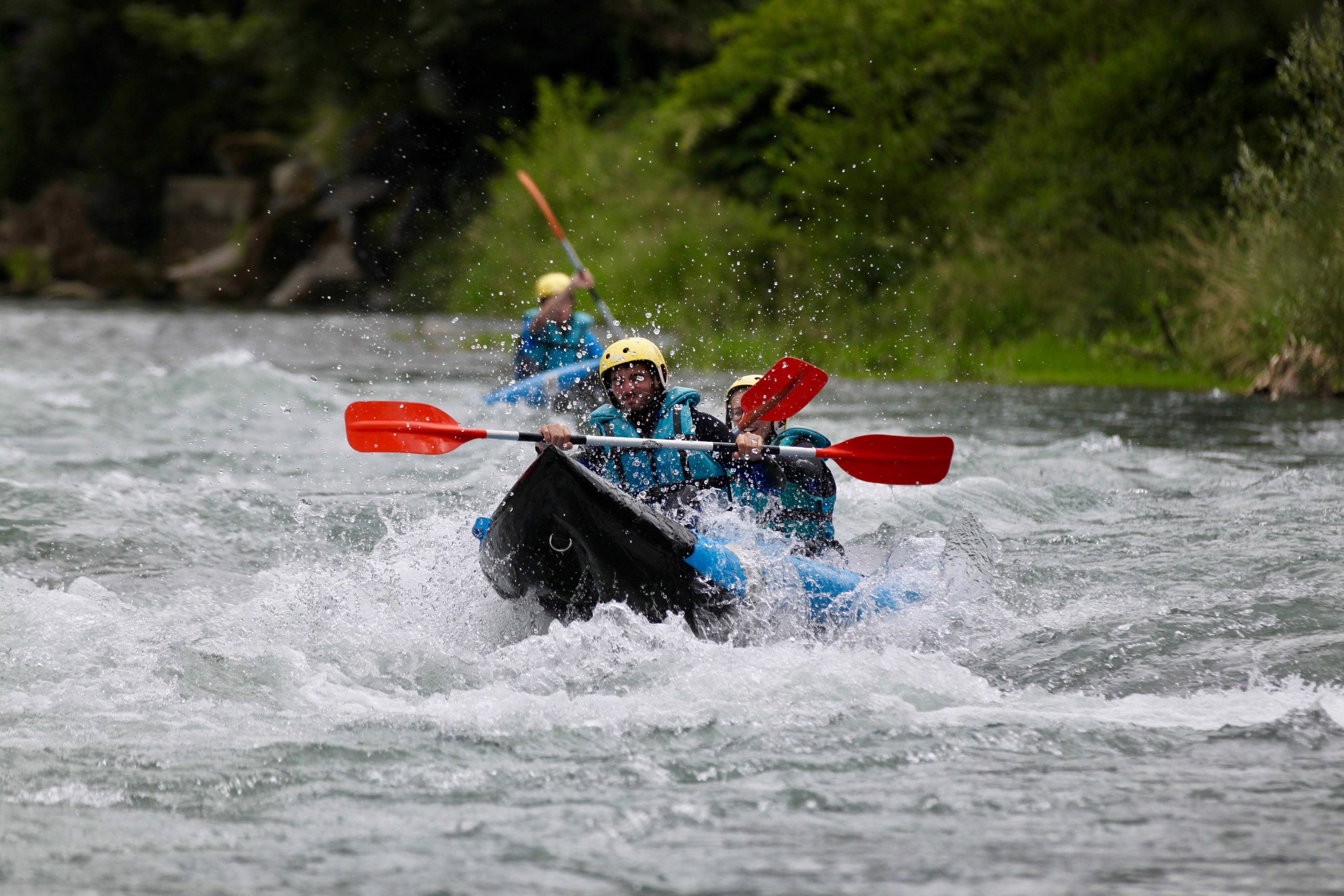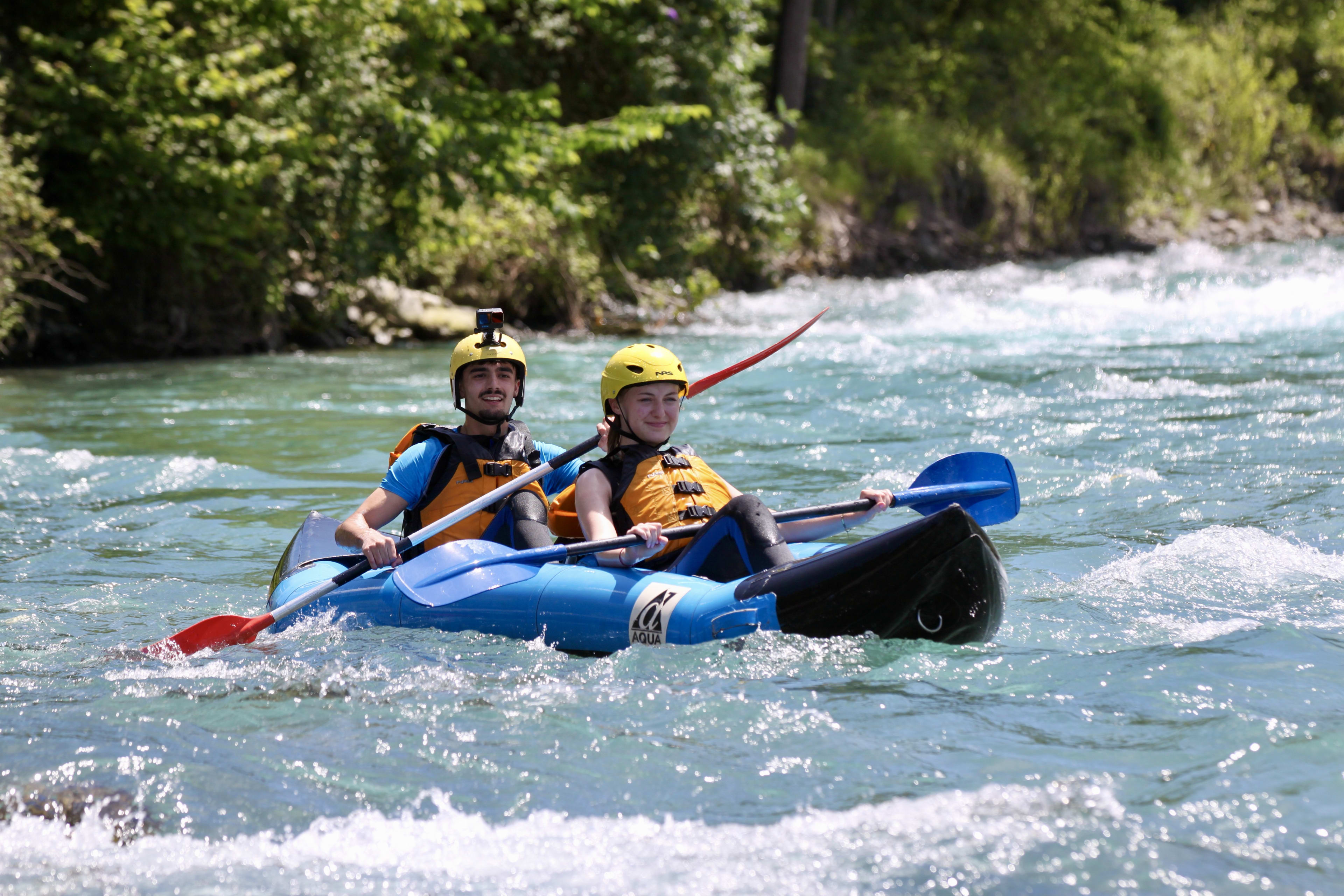 Zu zweit in einem Boot bezwingen Sie die Stromschnellen der Klasse 2 und 3 des Gave de Pau mit einem Kanufloß - auch bekannt als Hotdog!