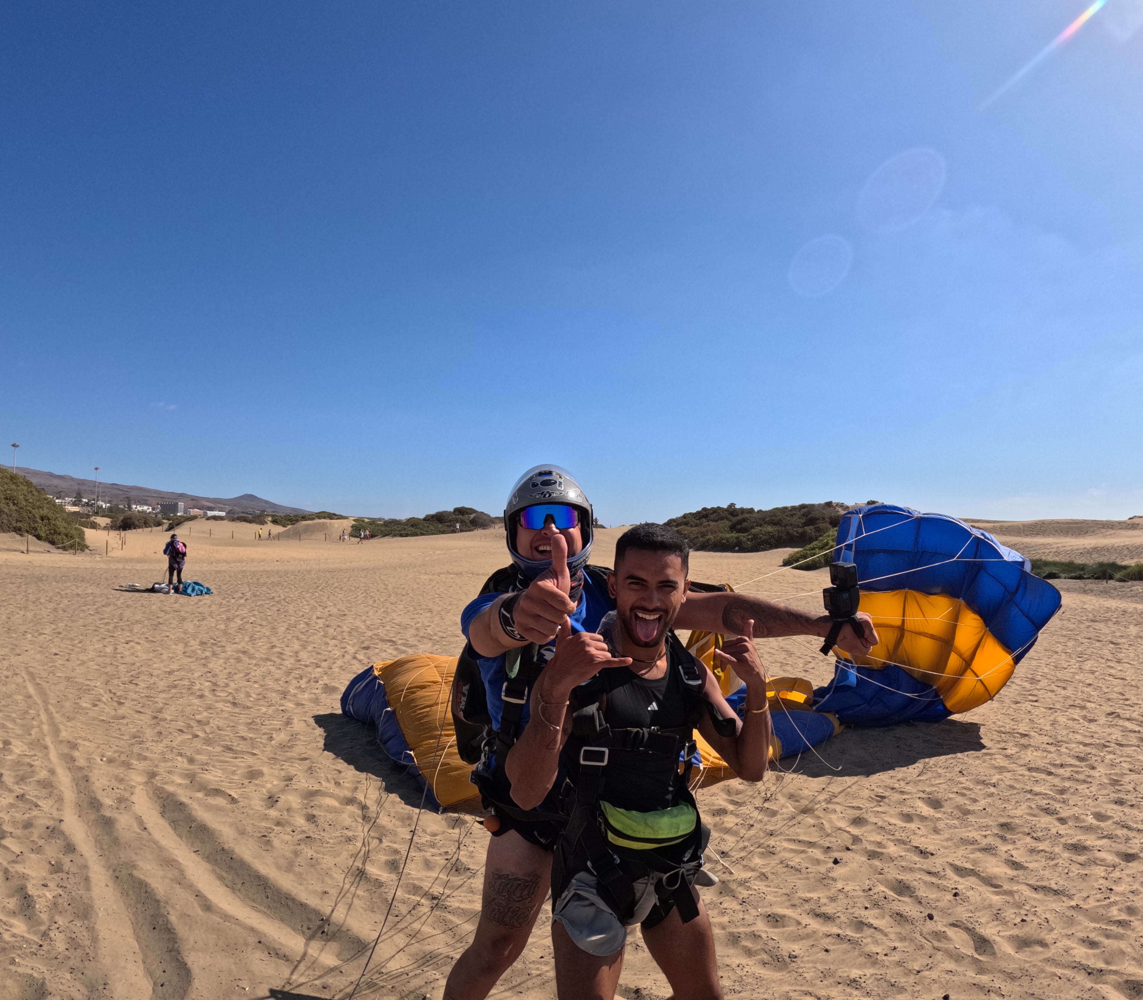 Tandem-Fallschirmspringen über der Düne von Maspalomas, Gran Canaria