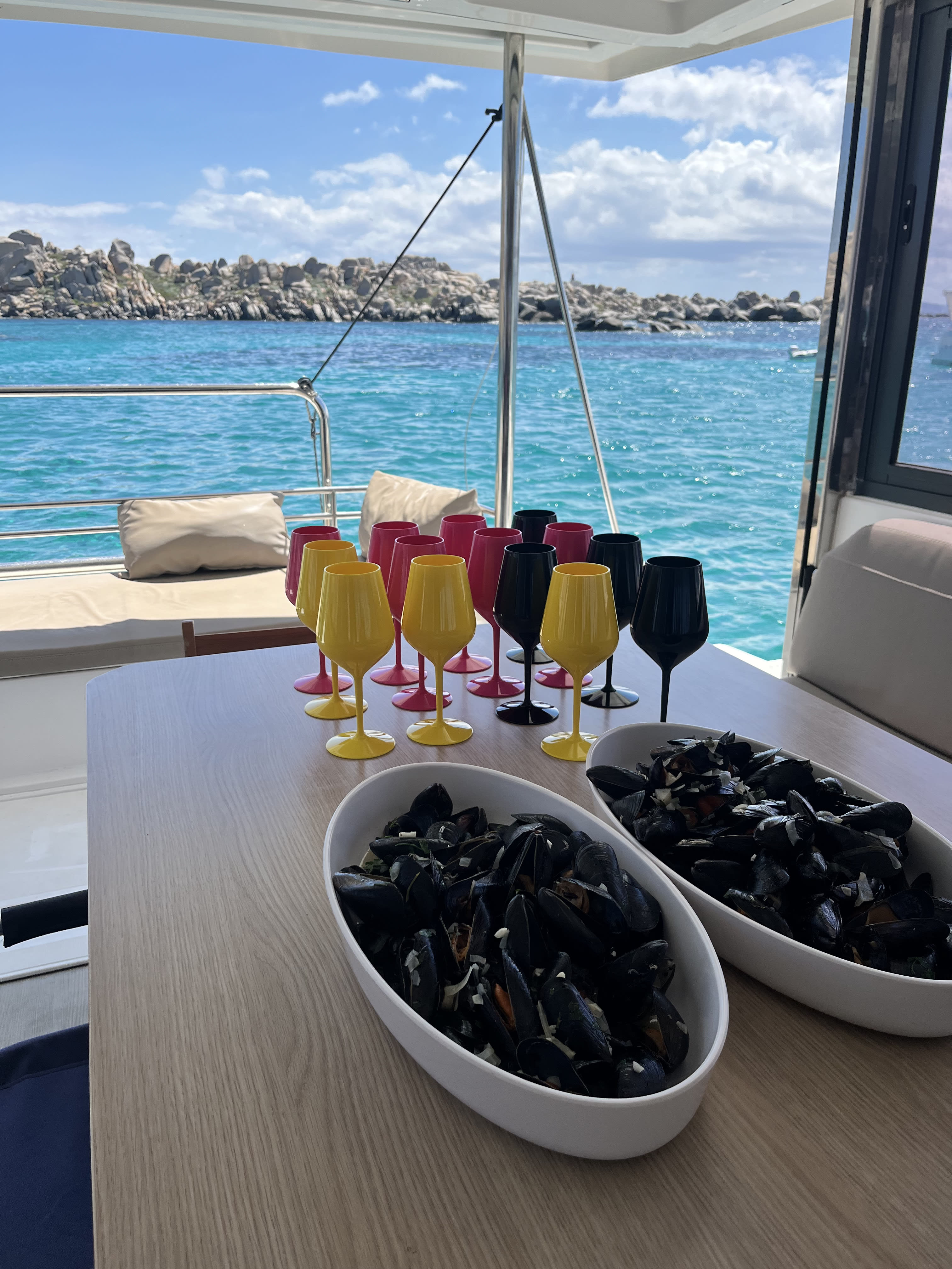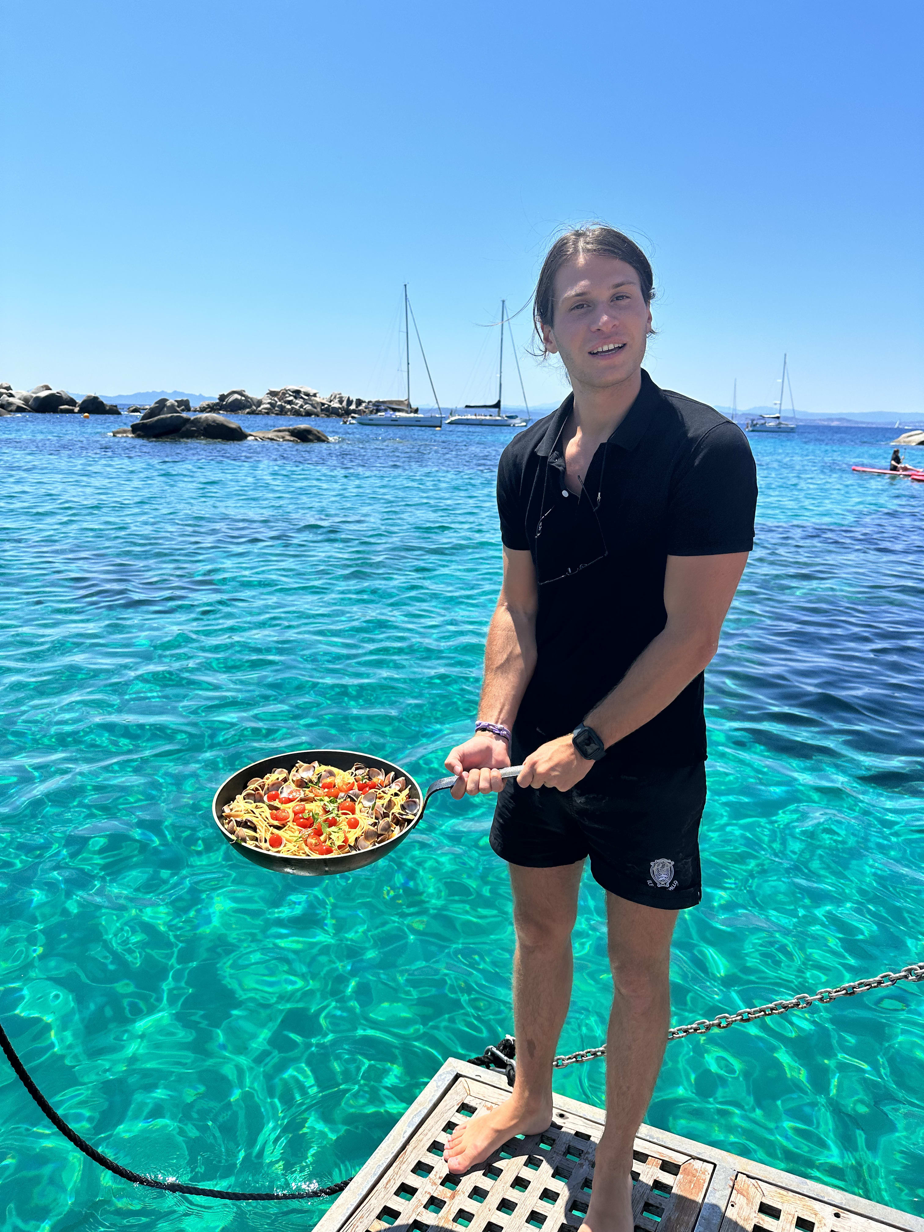 - Mittagessen, das vom Kapitän zubereitet wird: Nudeln mit Vongole (Venusmuscheln) nach dem Familienrezept
