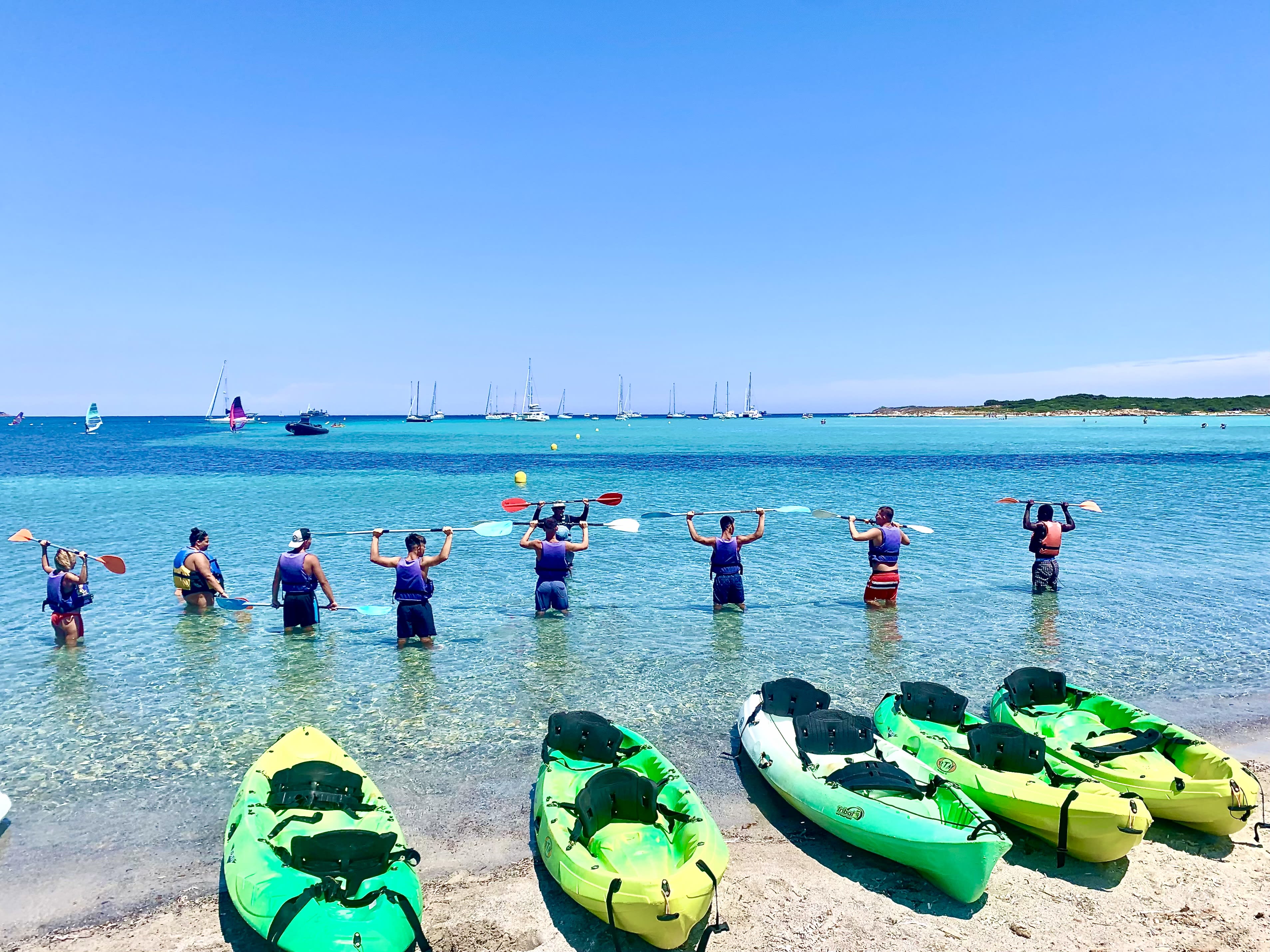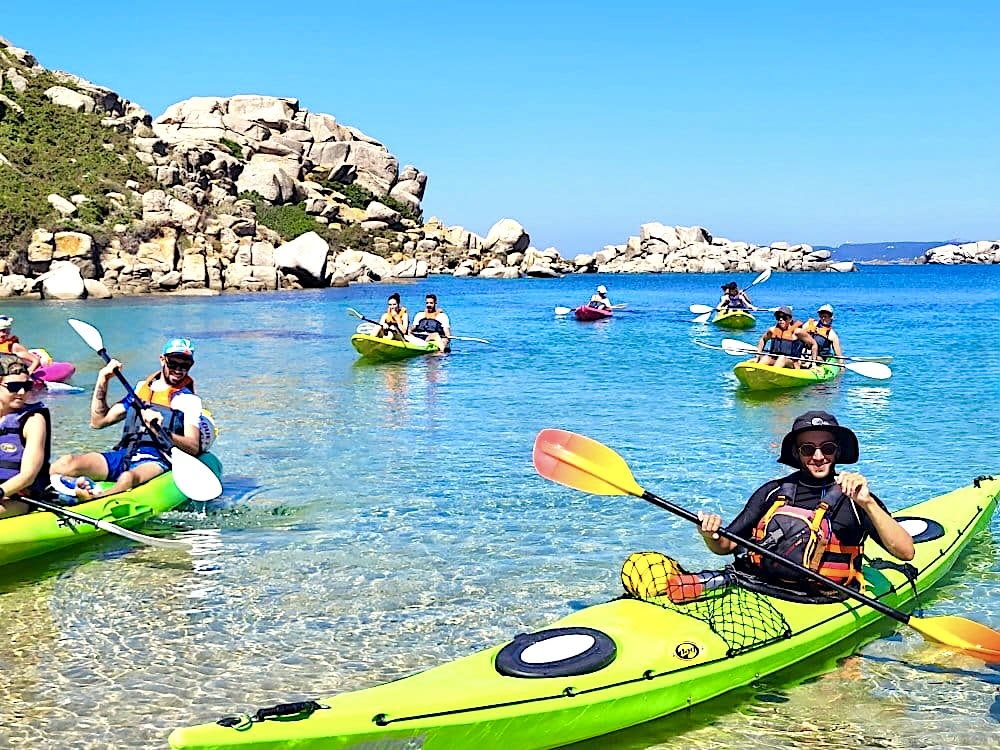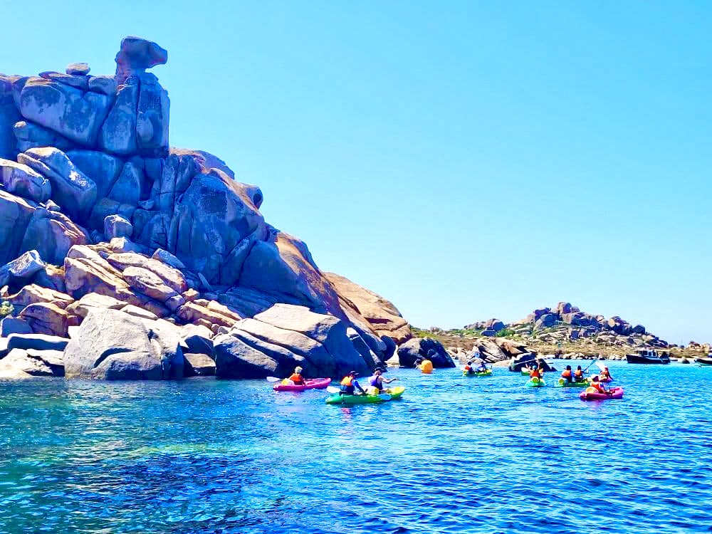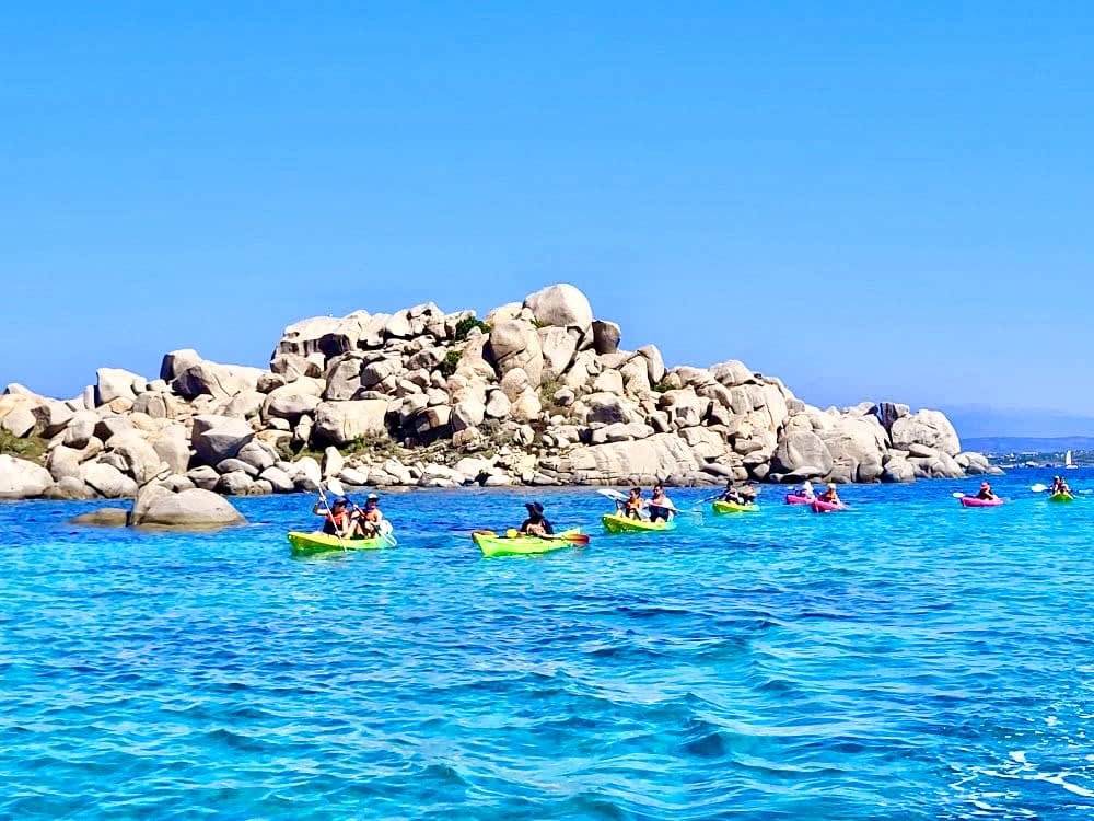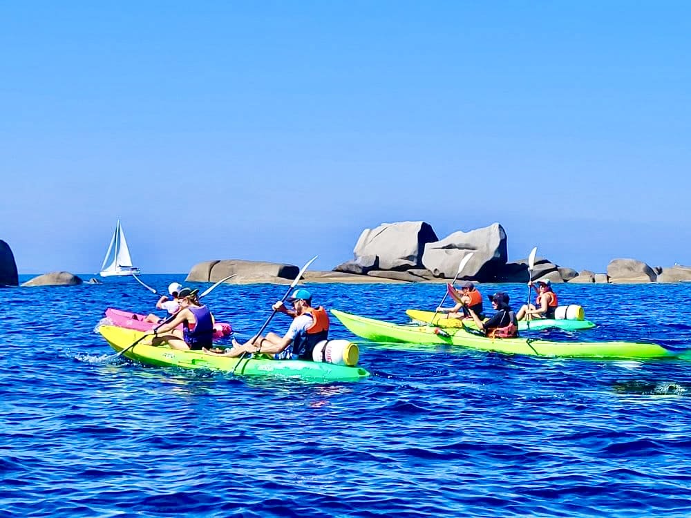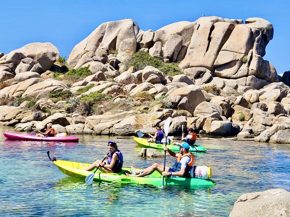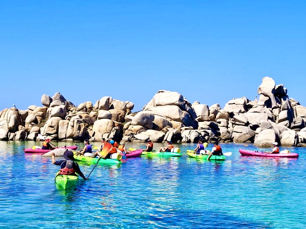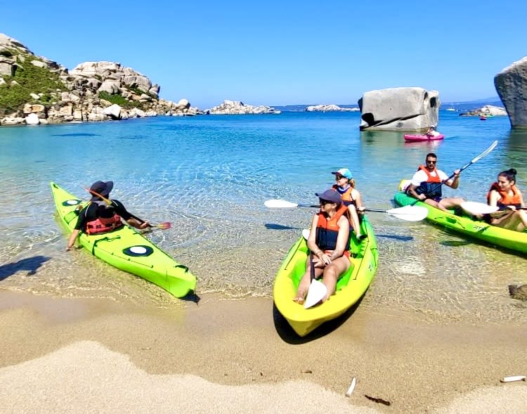 - Abfahrt zu einer 4,5-stündigen Seekajaktour zu den Lavezzi-Inseln, davon 2h45 Paddelzeit und 1h45 für verschiedene Pausen (Inselchen/Bäder/Höhlenwandern/Felsen), einschließlich Badestopps zur Beobachtung des Meeresbodens.