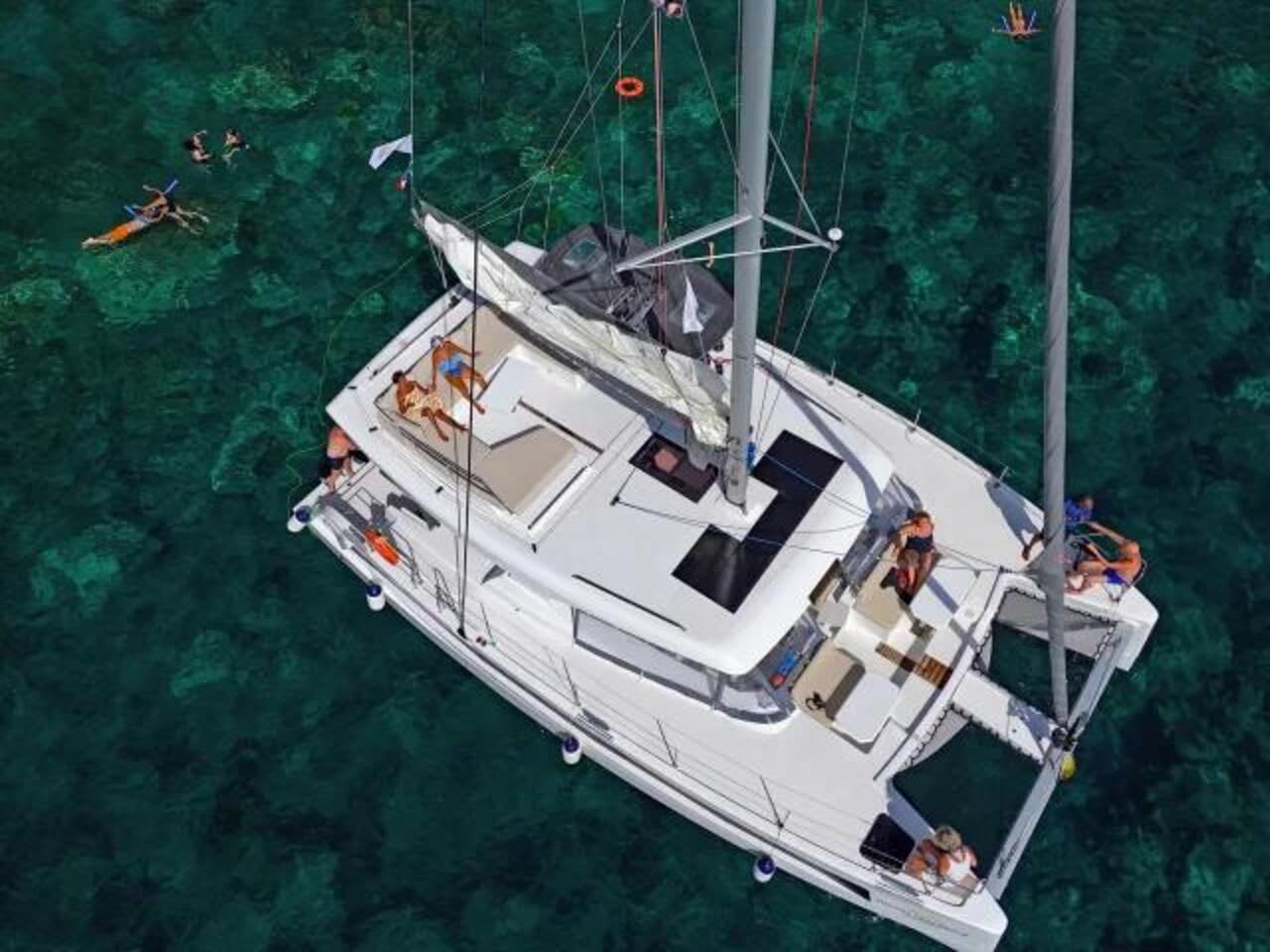 - Ausflug an Bord der Allegria, einem geräumigen und komfortablen Katamaran, der mit 2 Toiletten, einer Außendusche, Trampolinen am Bug, Bänken am Bug und am Heck, Sonnenliegen, einem Soundsystem, einer Innenbar und Kühlschränken ausgestattet ist