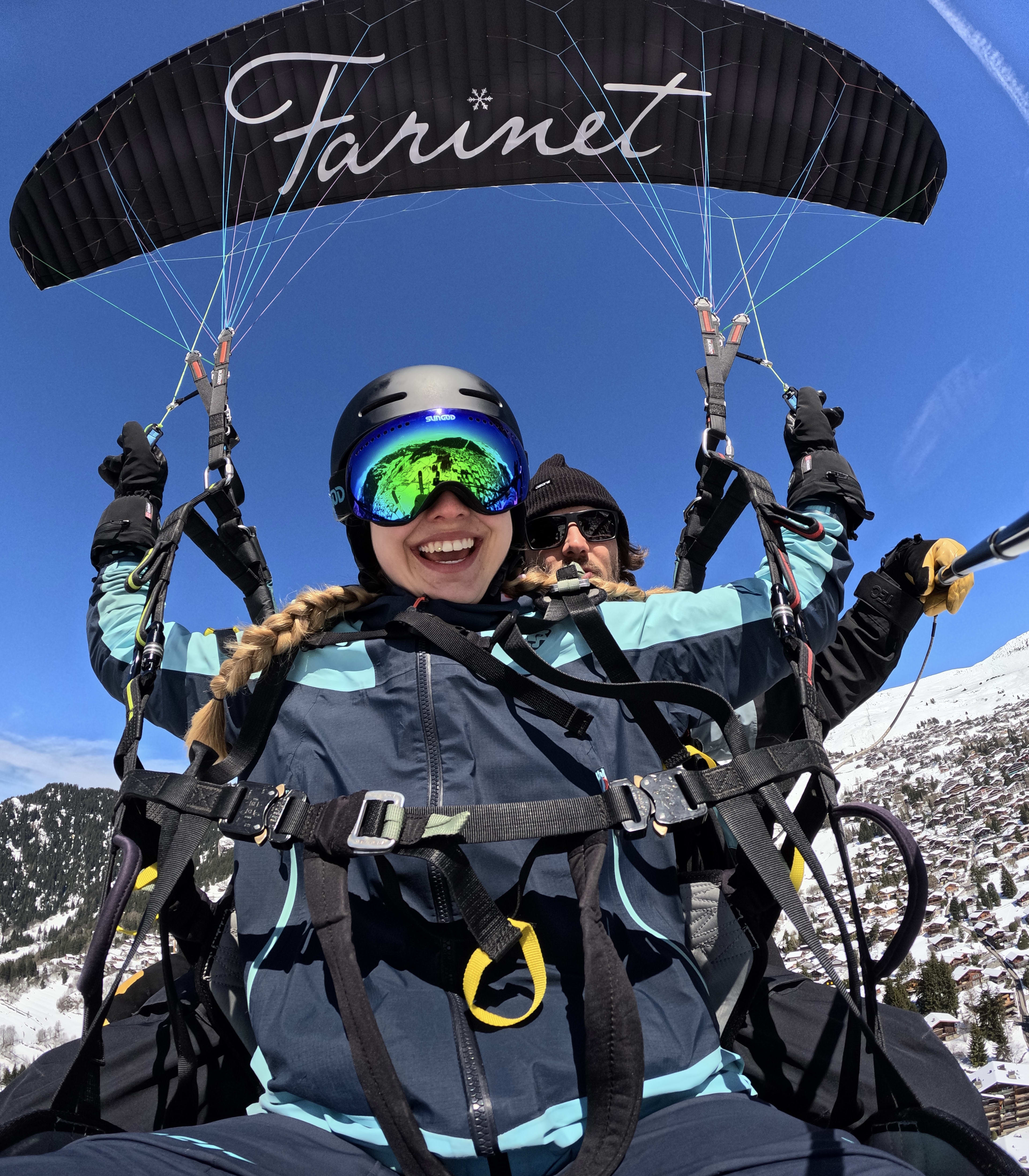 Im Winter beginnt Ihr Abenteuer in Les Ruinettes oberhalb von Verbier, wo Sie Ihren zertifizierten Paragliding-Lehrer treffen. Nachdem Sie sich mit Helm und Gurtzeug ausgerüstet haben, gibt Ihnen Ihr Pilot eine kurze Sicherheitseinweisung und erklärt Ihnen die Grundlagen des Starts und der Landung. Sobald Sie bereit sind, heben Sie mit ein paar schnellen Schritten auf der schneebedeckten Piste sanft in die Luft ab.