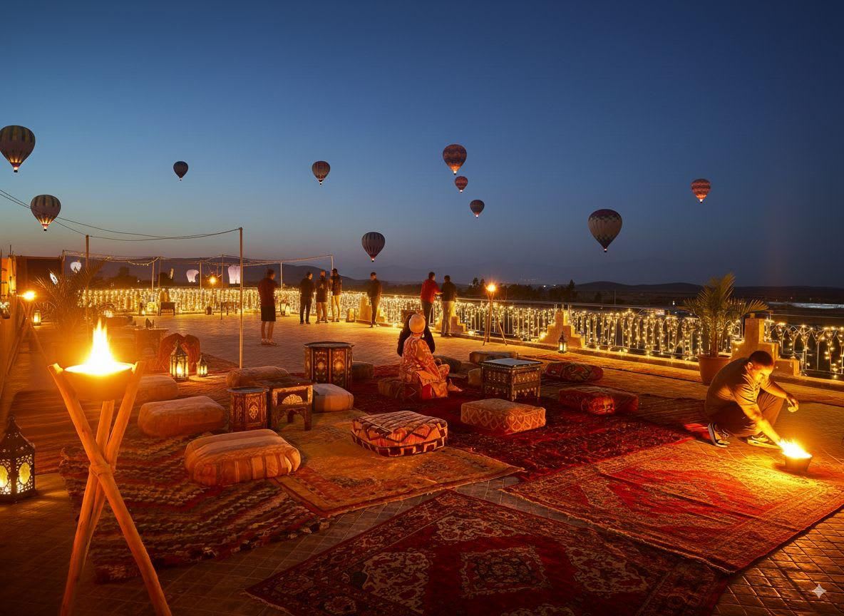 Die Hauptaktivität ist der Flug zum Sonnenaufgang, bei dem die Passagiere das erste Licht der Morgendämmerung über der Wüste und dem Atlasgebirge erleben können. Die Reise beginnt mit einem organisierten Empfang und geht dank einer einzigartigen Infrastruktur über die Landung hinaus: Das Unternehmen ist der einzige Anbieter, der über ein exklusives Panoramadach verfügt. Dieser raffinierte Rahmen bietet einen 360°-Blick auf die Umgebung und eignet sich perfekt für einen gemütlichen Ausklang der Reise.