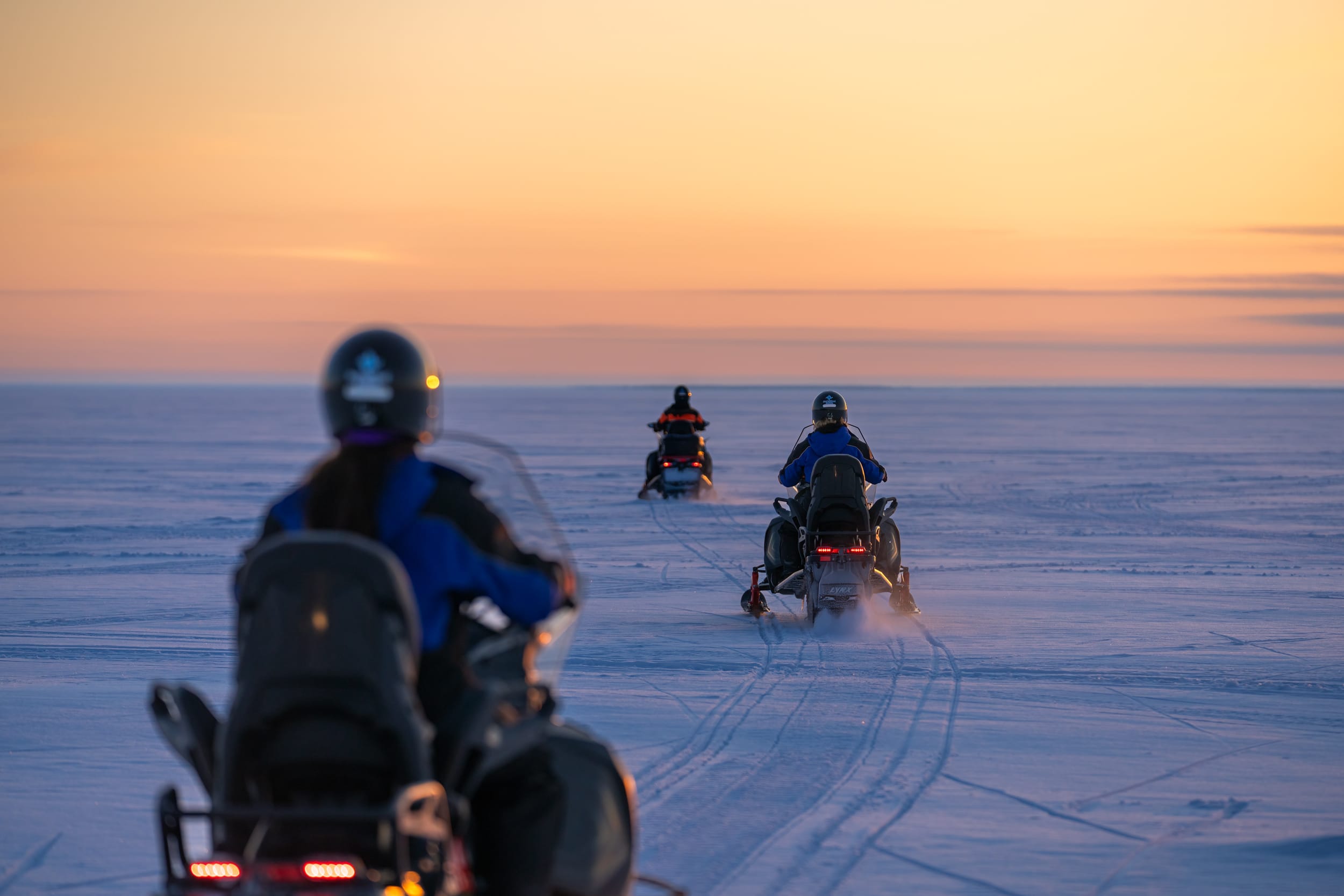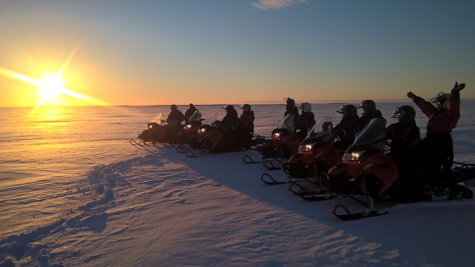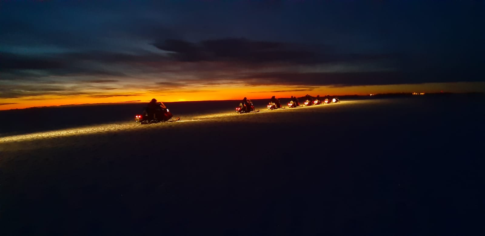 Next, you'll hop on the snowmobile and go! You'll ride over the frozen waters of the bay as you witness the sun rising or setting over the horizon in a beautiful spectacle of colours. Midway through the experience, you'll take a break with hot drinks to regain your strength, before returning to the original meeting point for the end of this wonderful ride.