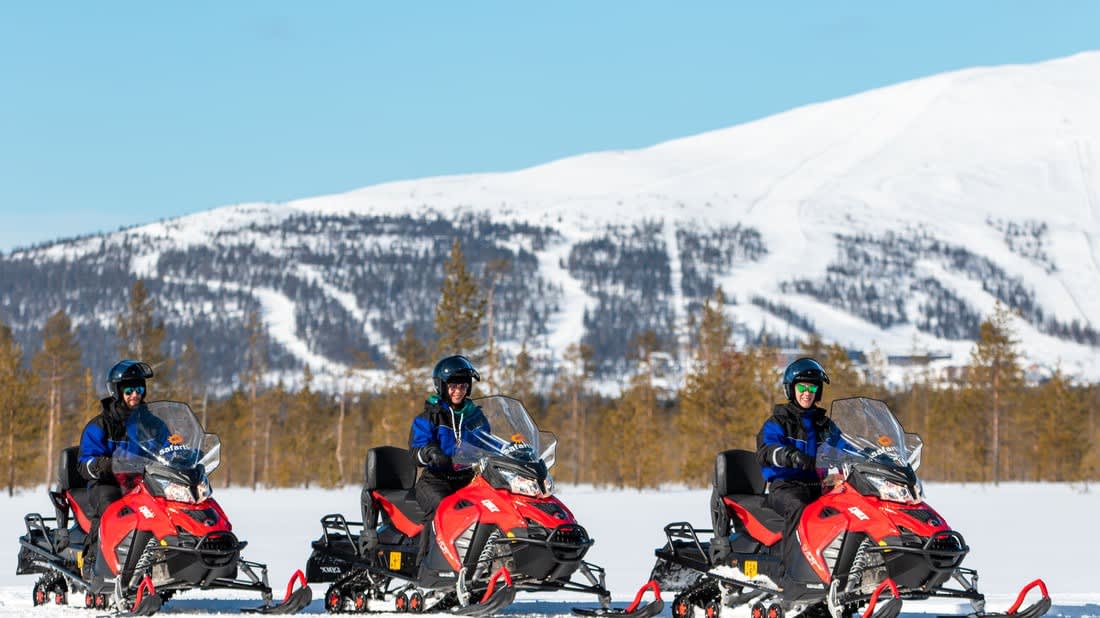 On the day of your snowmobile excursion with ice fishing in Ylläs, you'll have the chance to be picked up within a 15-kilometre radius of the village, or arrive at the Safartica headquarters at least 15 minutes before the starting time of your excursion. There, you'll meet your expert instructor, who will distribute the thermal suits, winter boots, woollen socks, scarves, beanies and gloves to keep you warm throughout the experience, as well as the helmets and snowmobiles (1 per 2 participants). Once you're all geared up, your instructor will give you a thorough safety briefing and a quick lesson on how to drive the snowmobile.