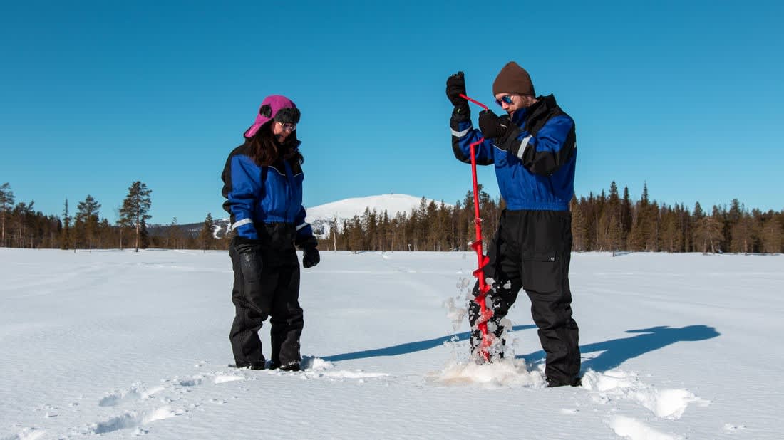Experience the thrill of driving over the snowy expanse of Finnish Lapland and try casting your line in the ice on a snowmobile ride with ice fishing in Ylläs!