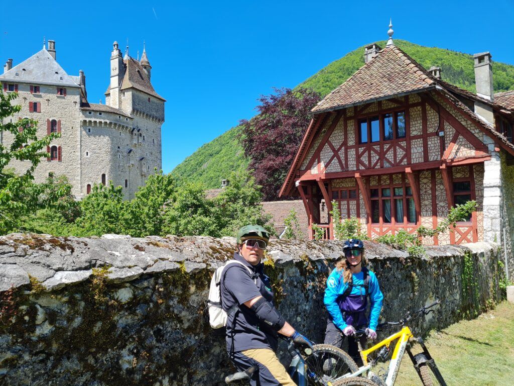 The course of the day is designed for total immersion. After a warm-up at the Roc de Chère, you will enjoy a panoramic break before heading down to the shores of the lake for a refreshing swim in Menthon. The route then gains altitude to pass by the majestic Menthon-Saint-Bernard Castle, before entering the forest paths between Bluffy and Alex. The experience is punctuated by a playful river crossing in "MTB-canyoning" mode and a final loop on technical trails offering unique riding sensations.