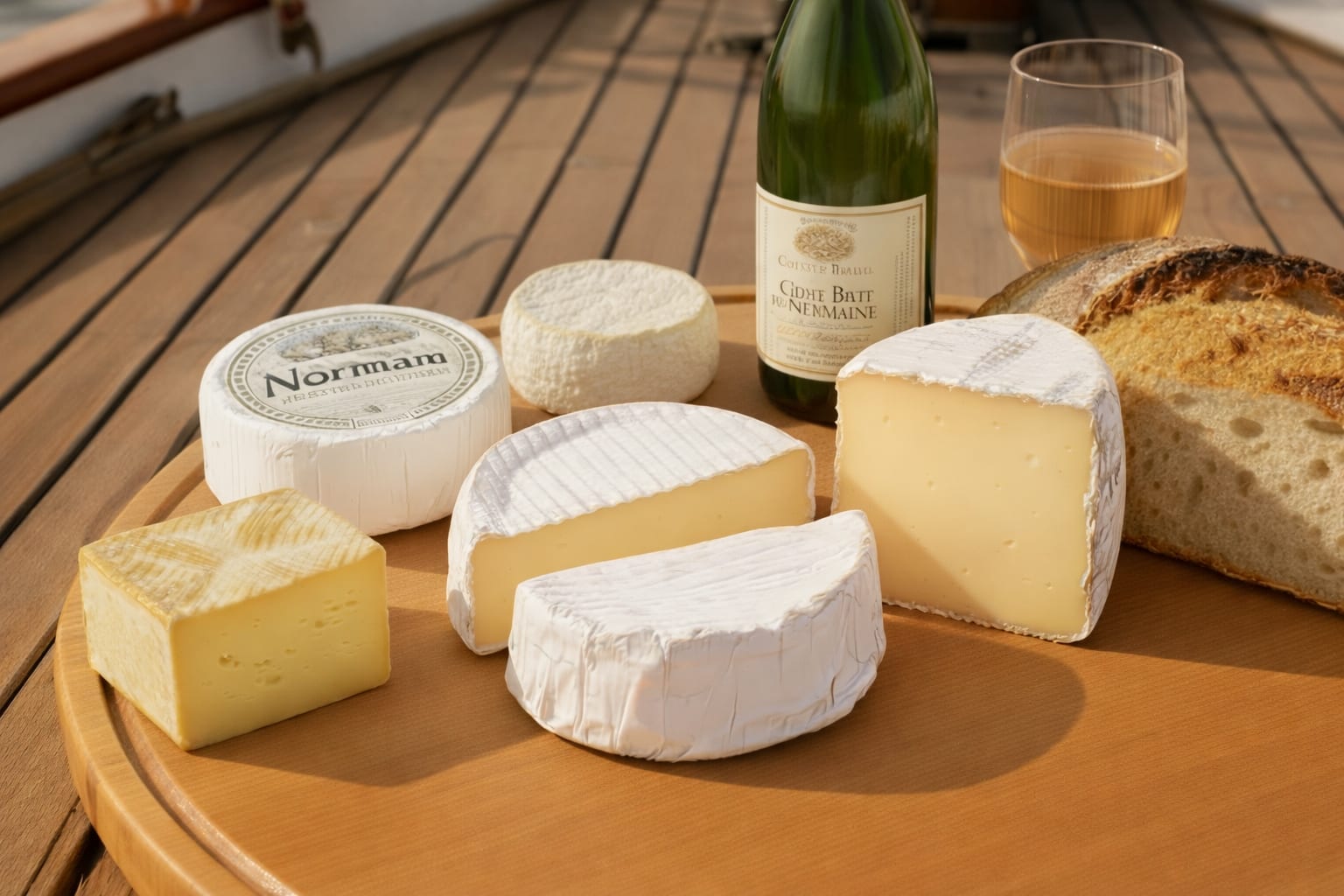 The captain sets sail towards the Seine estuary. You will cruise off the coast of Le Havre and the Normandy coastline to reach the highlight of the trip: passing under the imposing structure of the Normandy Bridge (Pont de Normandie). It is here, facing this giant of steel, that you will savour a platter of carefully selected Norman cheeses. For those choosing the stopover variant, the boat moors at the Old Basin (Vieux Bassin) in Honfleur for a gastronomic immersion with traditional restaurateurs, followed by a stroll through the historic streets near Sainte-Catherine church.