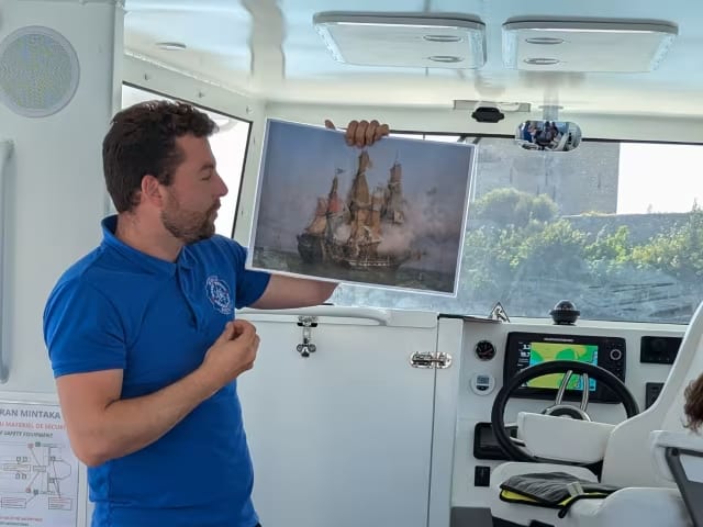 The activity begins with a historical introduction on board, lasting around 15 minutes, sheltered from the swell. You will learn about the major stages in the history of Saint-Malo: the corsair city, its emblematic figures, its strategic role over the centuries... The cruise then continues along the coast to illustrate the captain's words with the sites visible from the sea.