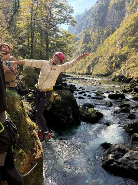 - Start of the via ferrata route above the Piva River with continuous guide supervision (60–90 min)