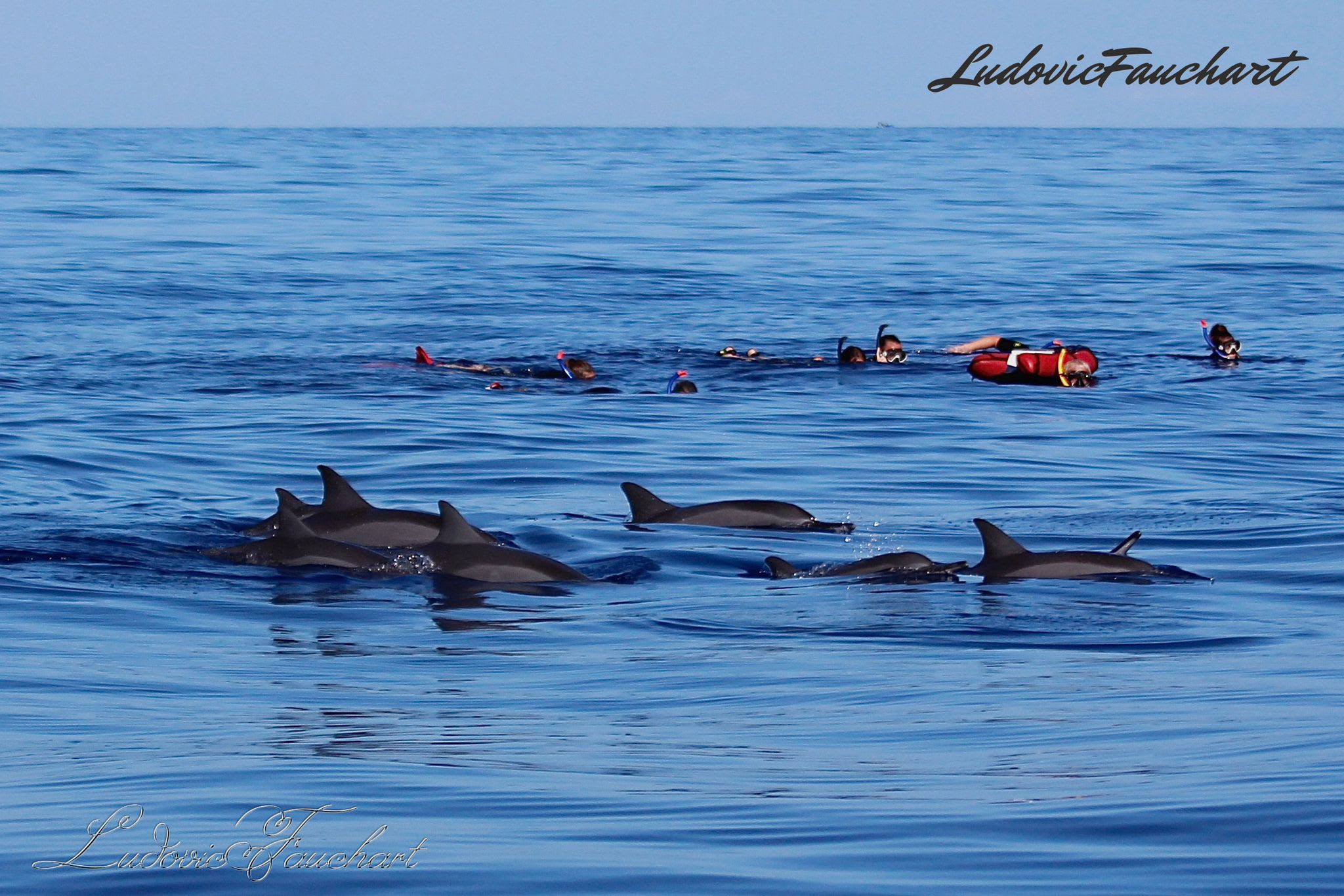 Snorkelling and swimming with dolphins and whales at Saint-Gilles-les-Bains in a small group of 10 participants maximum (6 swimmers and 4 accompanying passengers).