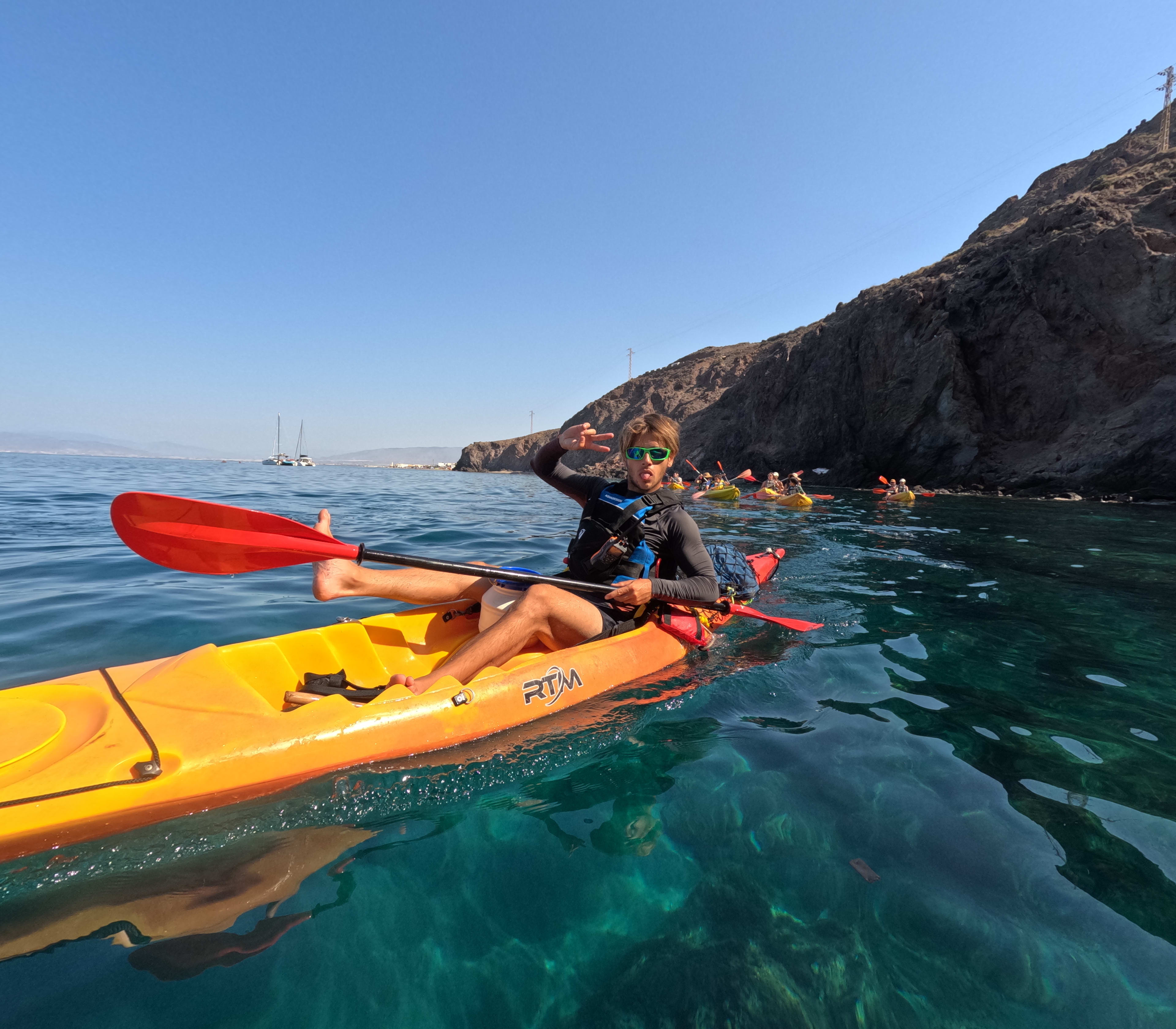With tips and anecdotes from your passionate guide, you will follow a safe sea kayaking route of around 4.5 km along the Cabo de Gata coast. Throughout the excursion, you will enjoy impressive cliff-lined scenery and have the opportunity to swim and paddle through waters so clear that you can see the seabed directly from your kayak. In the water, you may spot a variety of marine life such as sea bass, bream, groupers and sea urchins, and if you wish, you can take part in a snorkelling session to observe them up close.