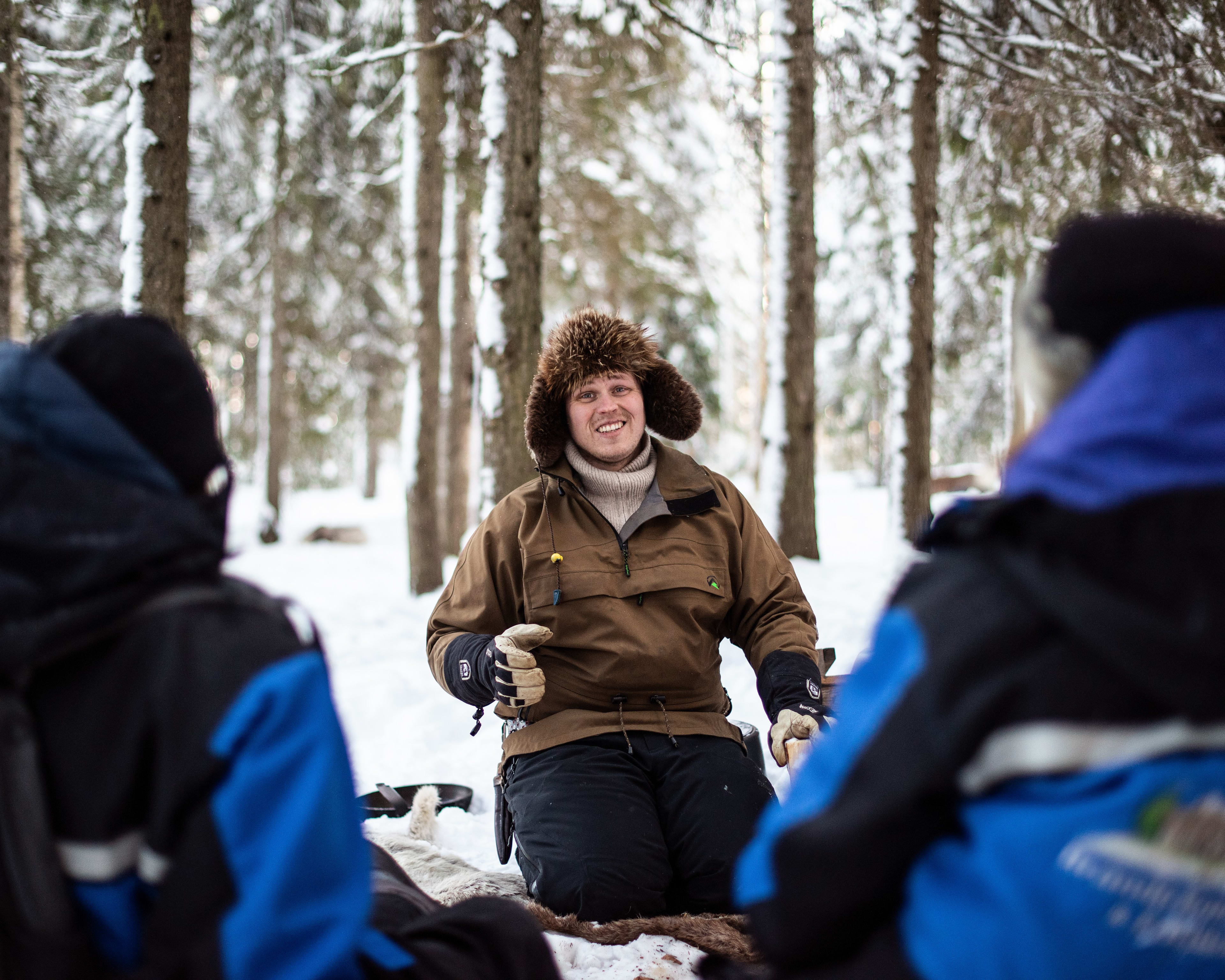 Once you're ready, the adventure will start! You will first meet a local Sámi family, who will share their ancient culture and way of life with you, teaching you about their customs and ancient practices. Next, you'll walk into the reindeer enclosure, and your expert guide will teach you about the "year of the reindeer", which will include when reindeer are born, what they do in the summer, how they survive in the winter, how herders work with the reindeer, and more. Then, you'll take the reindeer for a walk in the forest toward a traditional Sámi tent that will be waiting for you, and you'll settle down with a cup of tea or coffee while your instructor prepares the delicious lunch you'll have in the incredible atmosphere of the Arctic forest.