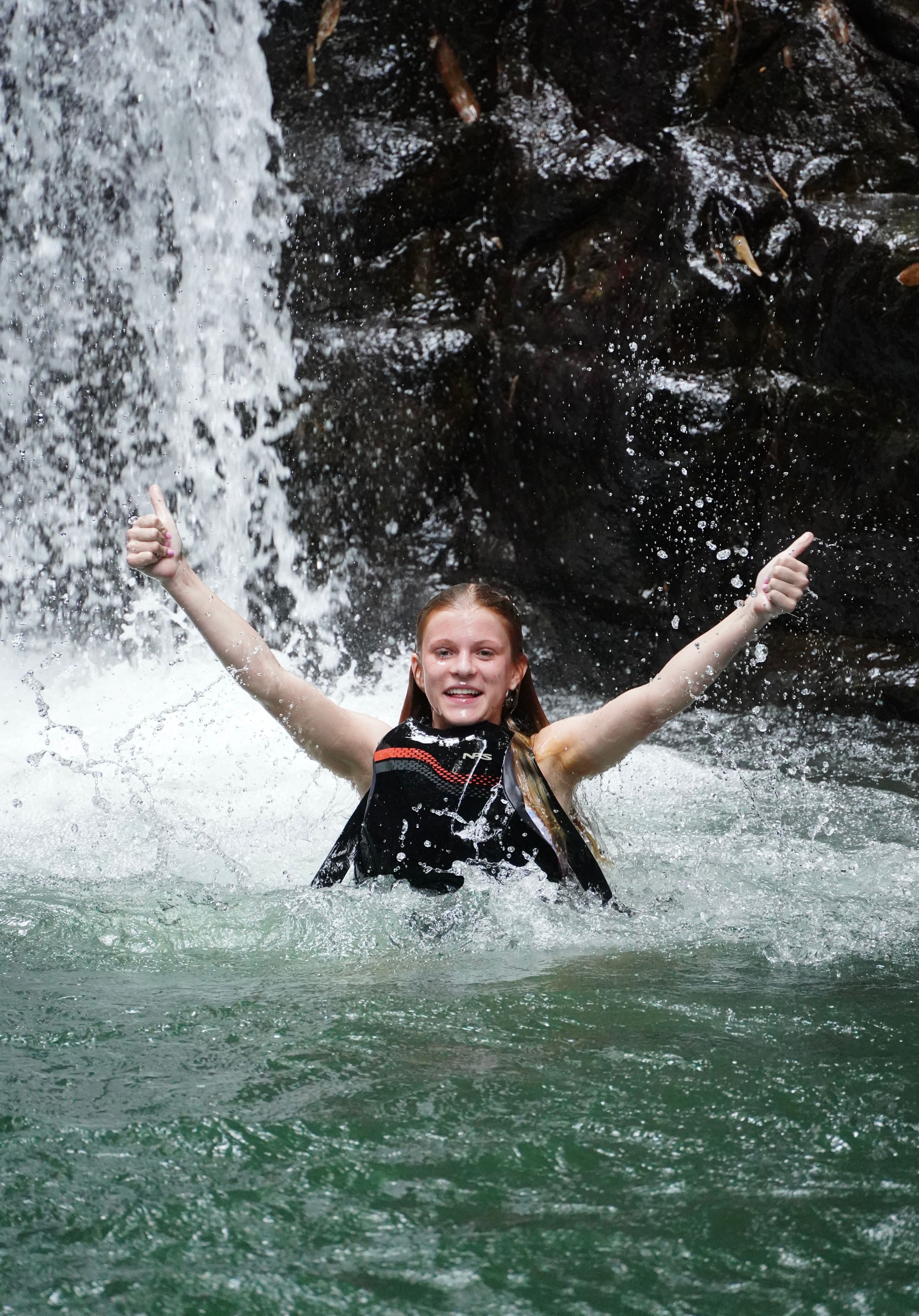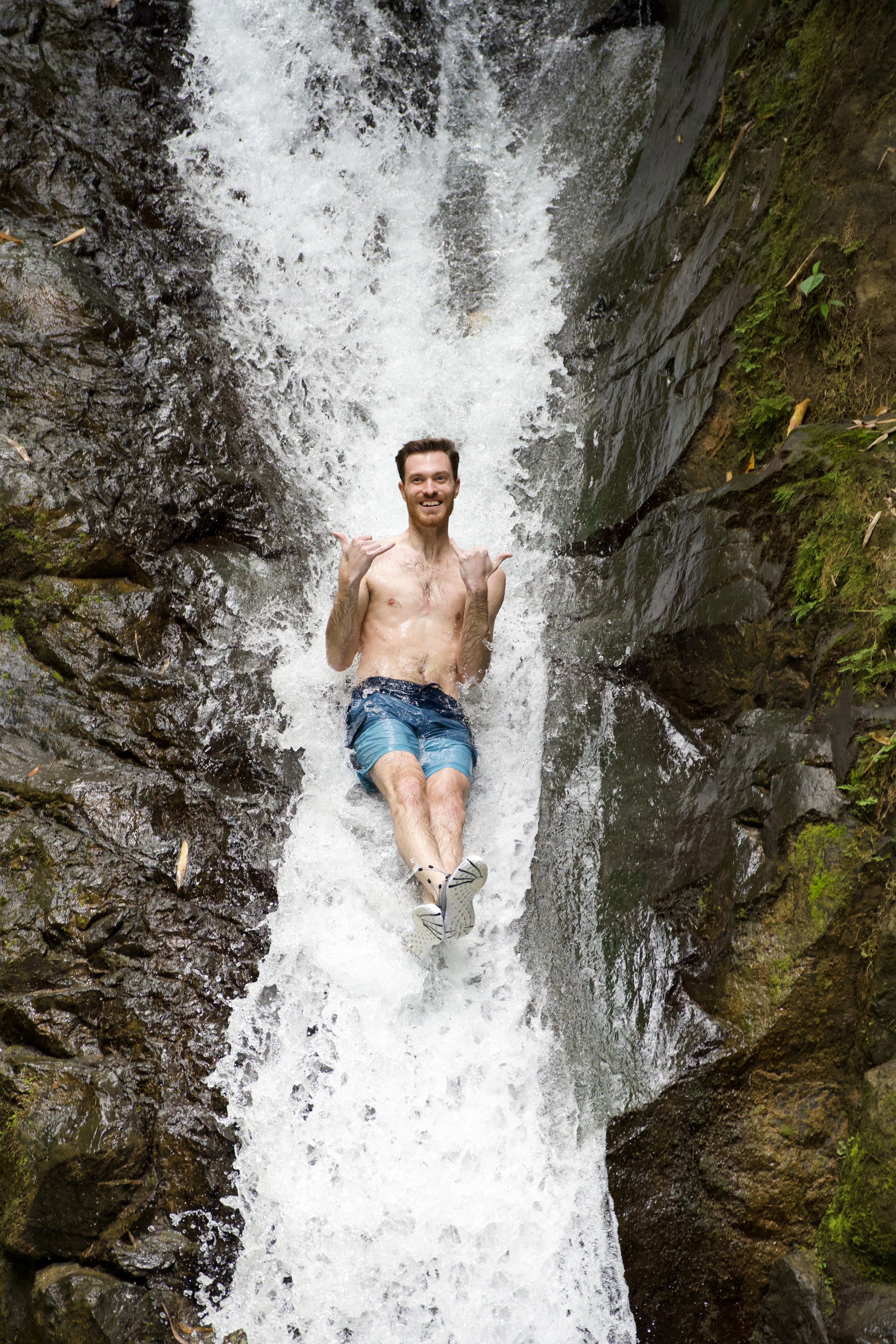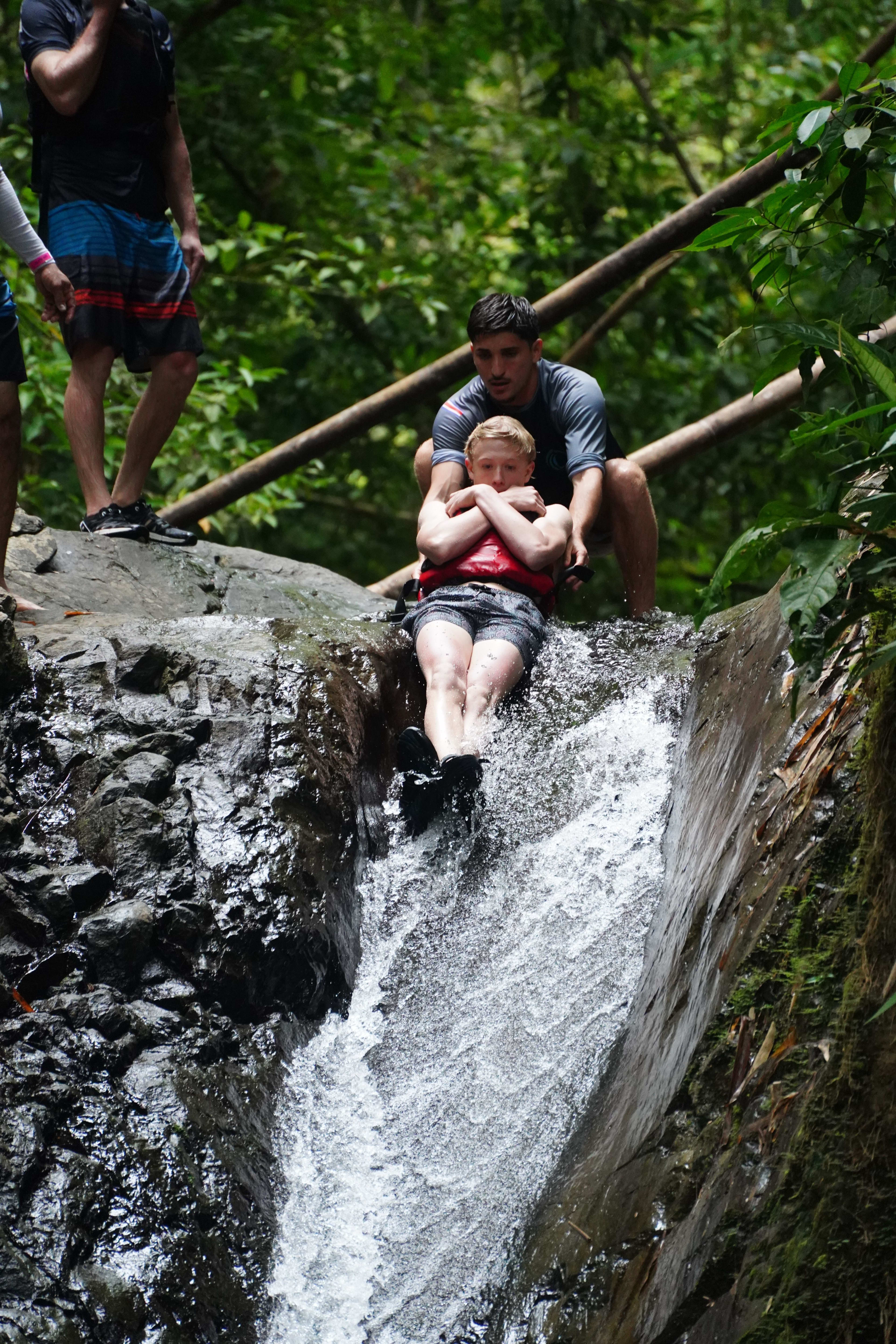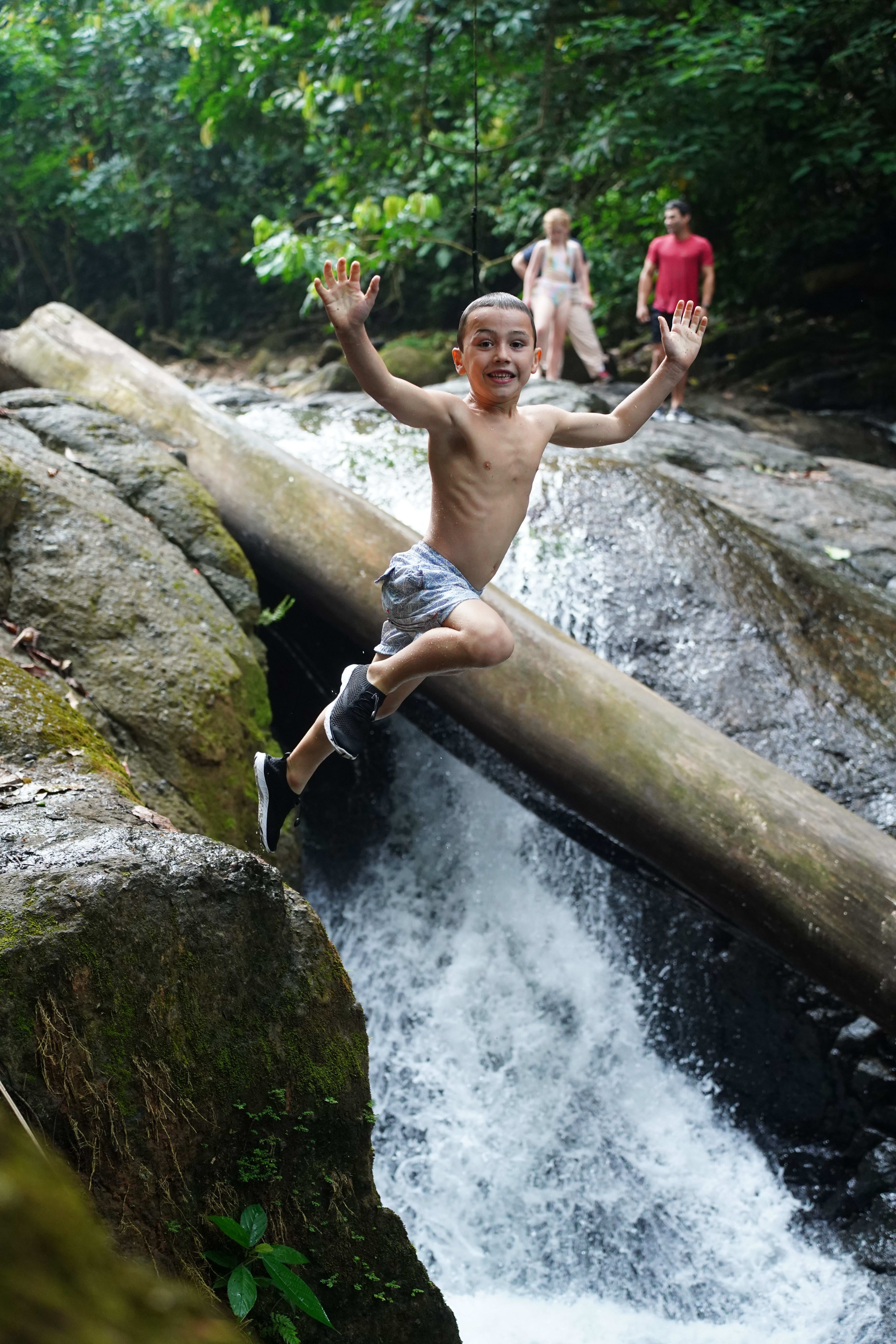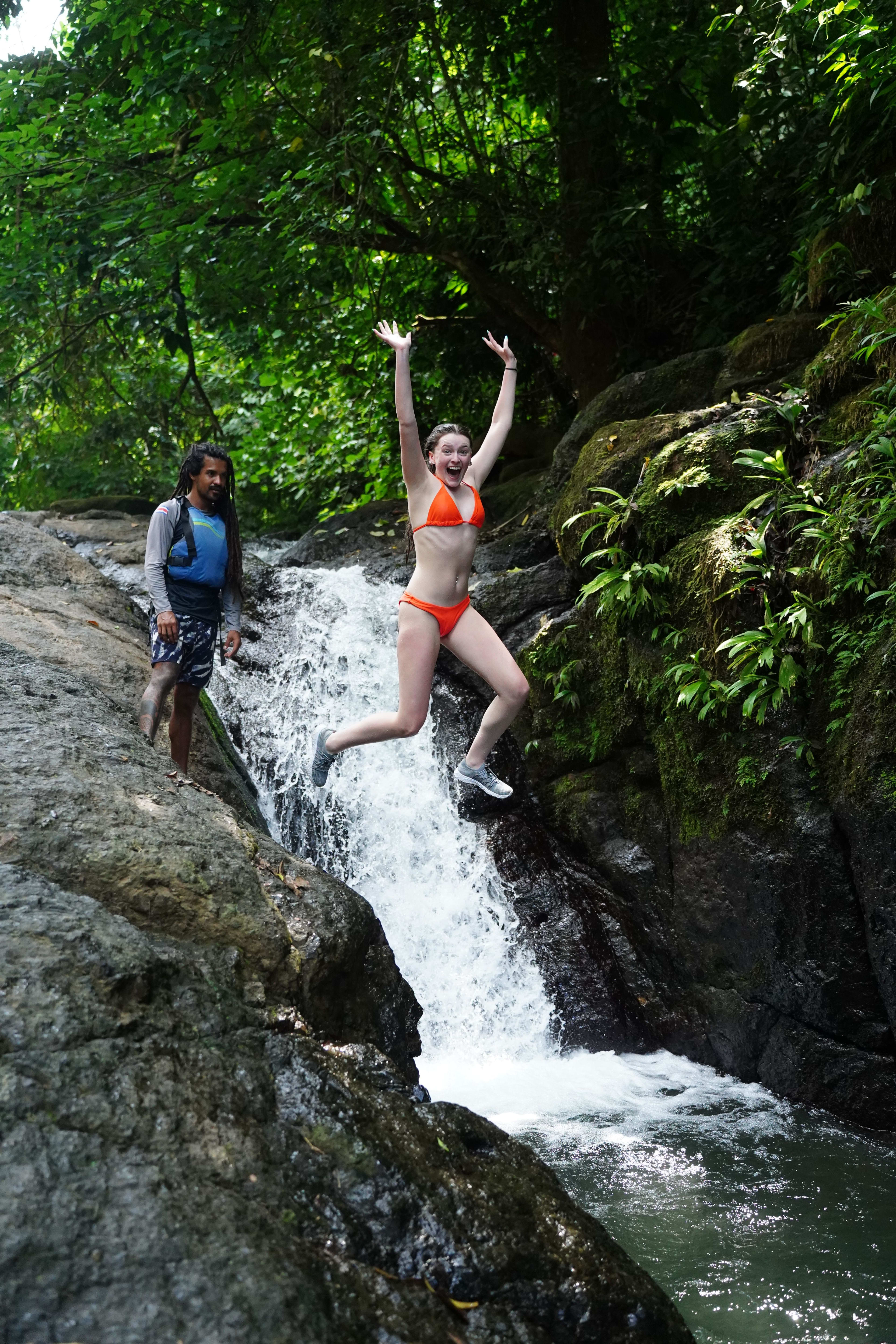 ¡Experimente el subidón definitivo de la selva! Súbete a un tobogán de roca natural de 9 metros, salta hasta 9 metros y explora cuevas marinas en un safari en cascada desde Manuel Antonio.