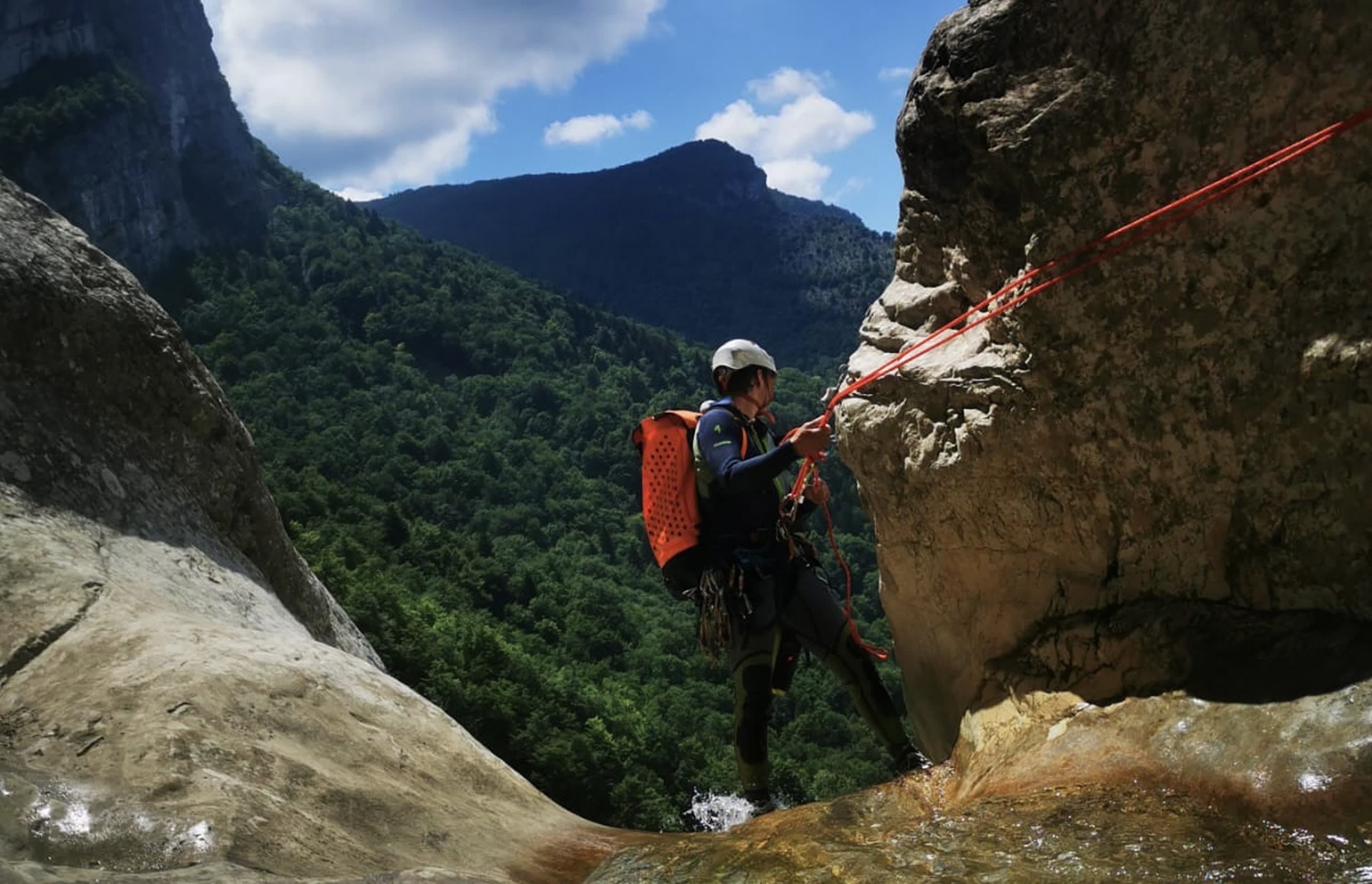 Recorra los senderos acuáticos y explore el cañón de Ecouges con un monitor experimentado y un grupo reducido. Esta excursión de barranquismo está abierta a los deportistas a partir de 14 años que se sientan cómodos con el rápel y que, preferiblemente, ya hayan practicado barranquismo o escalada.