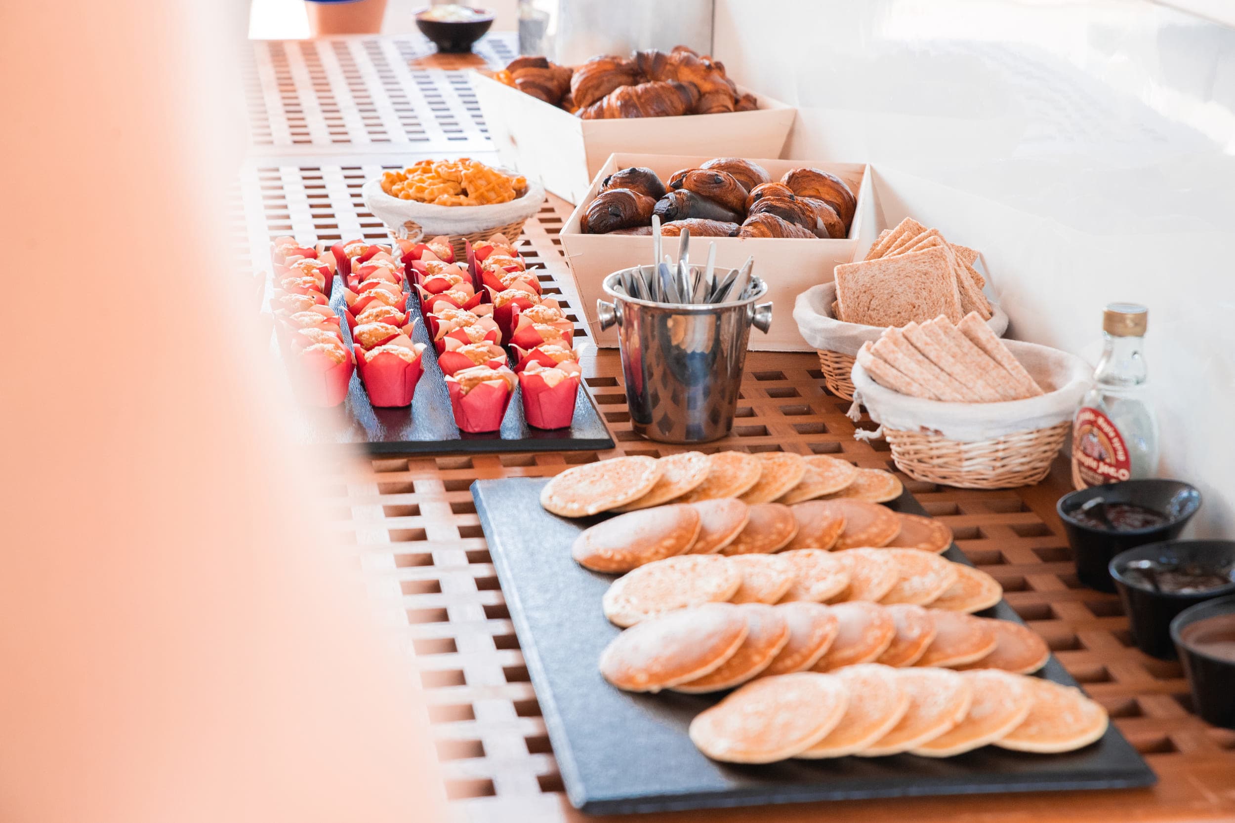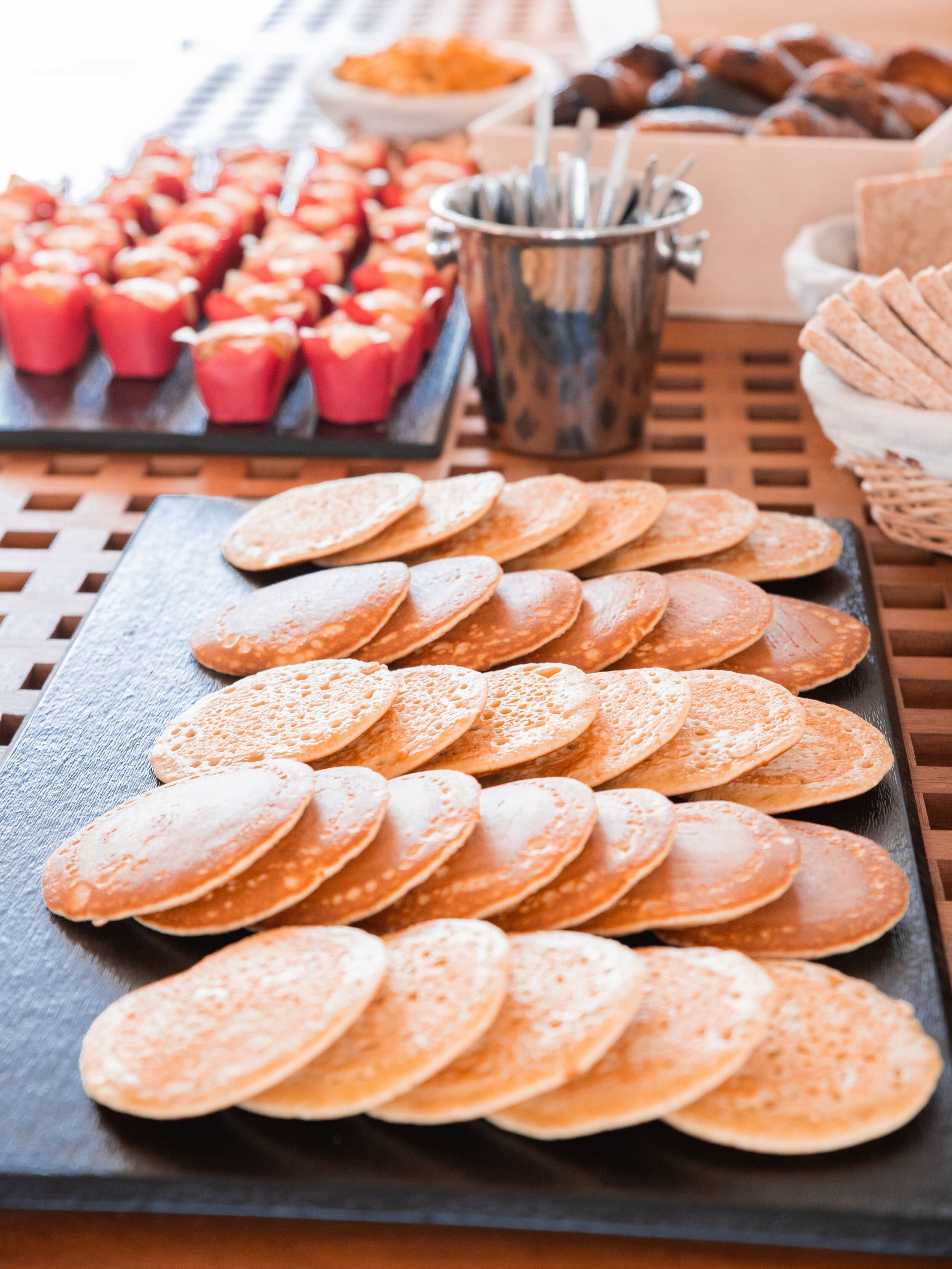- Buffet completo incluido: salado (salmón ahumado, charcutería, huevos) y dulce (bollería, tortitas).