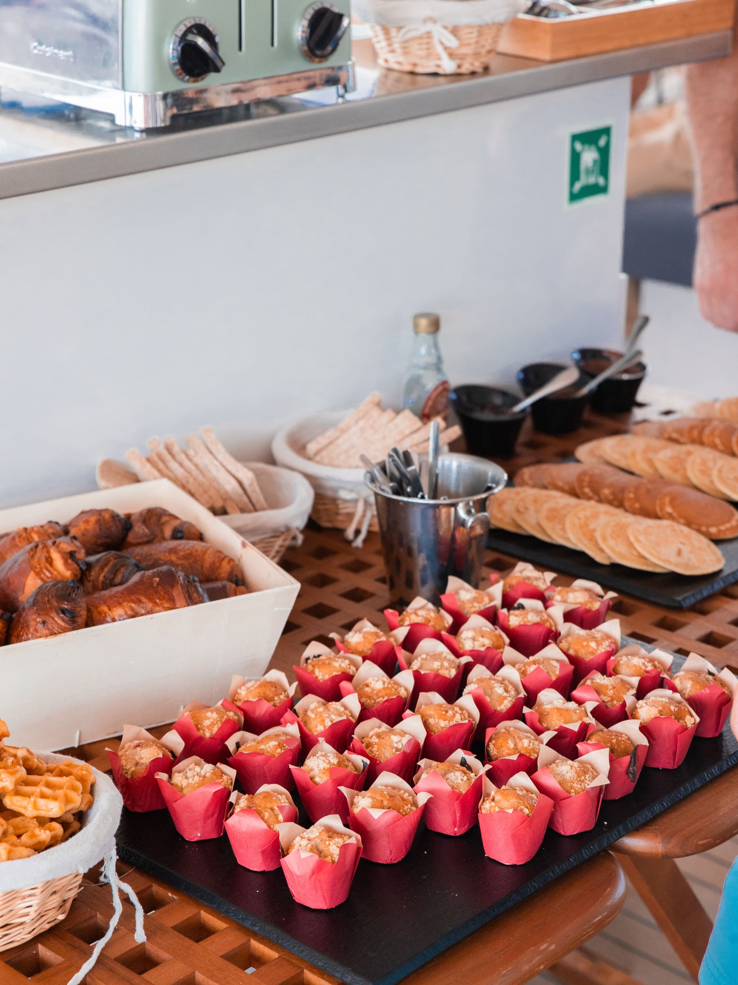 - Primer fondeadero - Calanque de Monastério (2h): El catamarán echa el ancla en un entorno de naturaleza virgen donde reinan la calma y la serenidad. Disfrute de un fondeo privilegiado, rodeado de paisajes esculpidos por el tiempo. A bordo se sirve un brunch buffet, en un ambiente cálido y relajado, mientras que los remeros están disponibles para aquellos que deseen navegar por el agua.