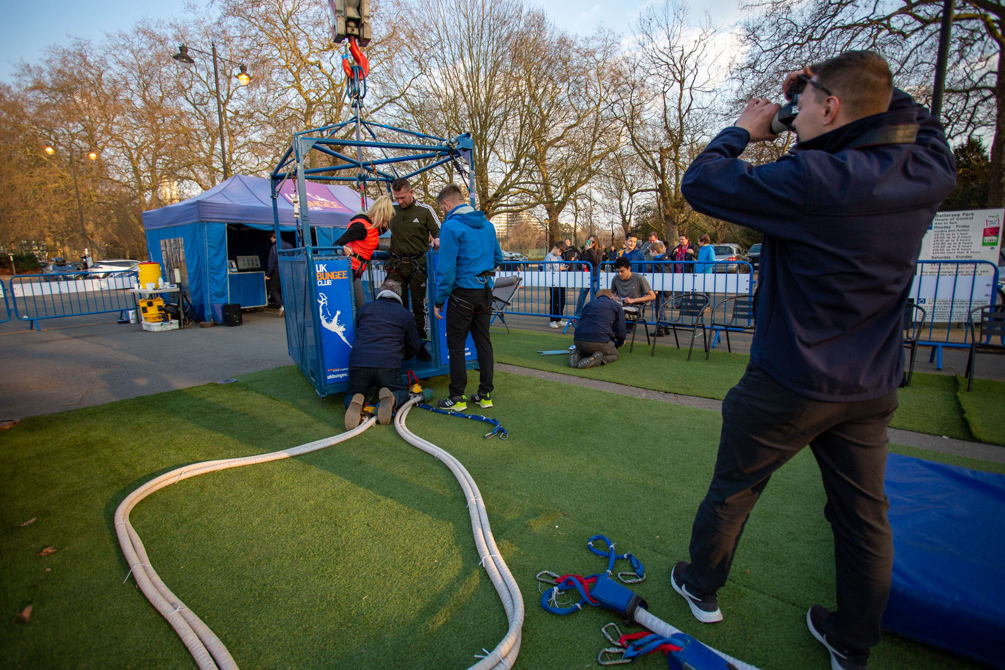 Veuillez vous abstenir de porter des bottes ou quoi que ce soit qui puisse interférer avec les harnais de cheville, sinon ils devront être enlevés avant le saut.