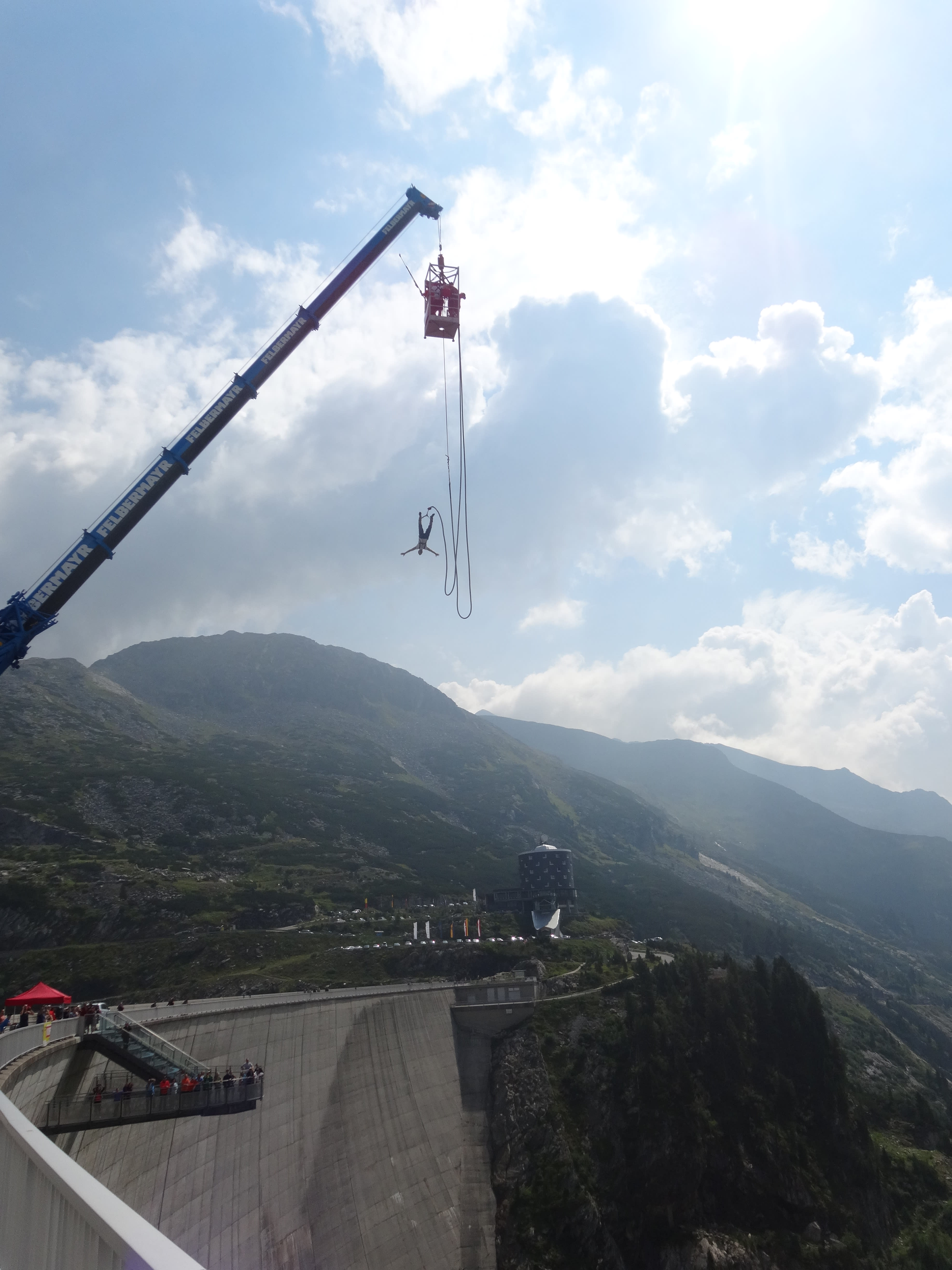 Un saut à l'élastique au barrage de Kölnbrein, dans la vallée de la Malta, depuis une nacelle suspendue à une grue sur le barrage, à 165 mètres de haut.