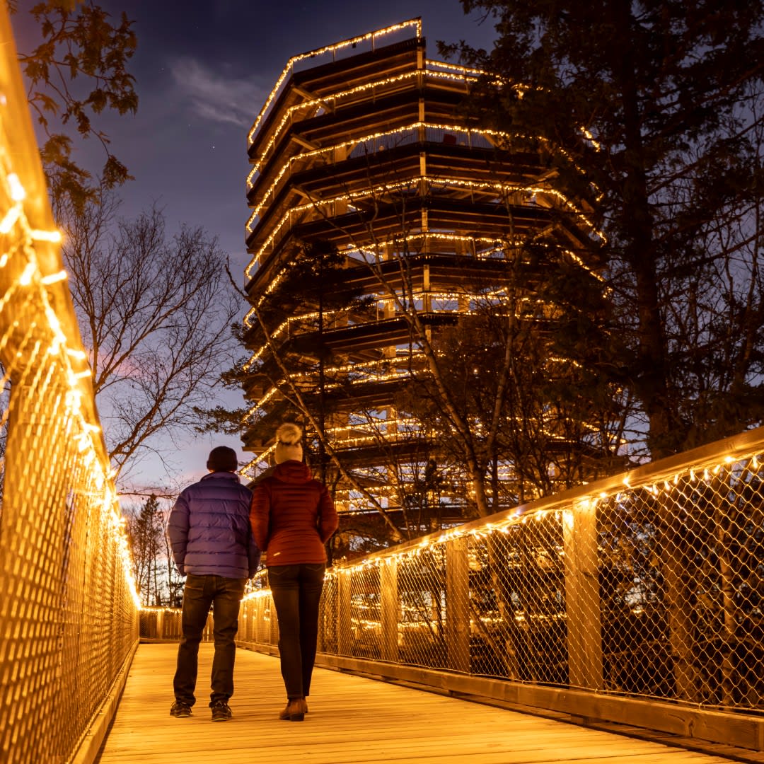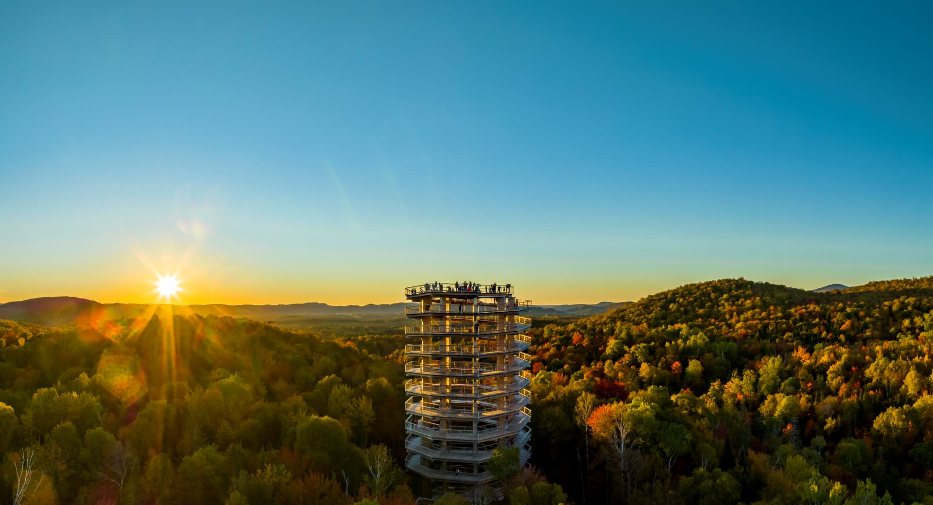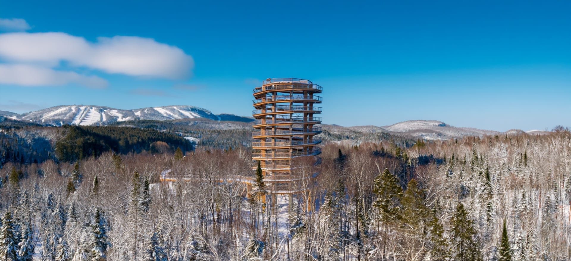 Tour panoramique s’élevant à 40 mètres de hauteur, l’équivalent d’un immeuble de 12 étages, le sentier des cimes dans les Laurentides offre une petite randonnée au-dessus des arbres près de Mont-Tremblant à Mont-Blanc. Accessible à tous, la balade du sentier des cimes permet de découvrir des paysages magnifiques depuis son sommet, mais aussi d’en apprendre davantage sur la faune et la flore de la région pendant cette randonnée dans les Laurentides près de Mont-Tremblant.
