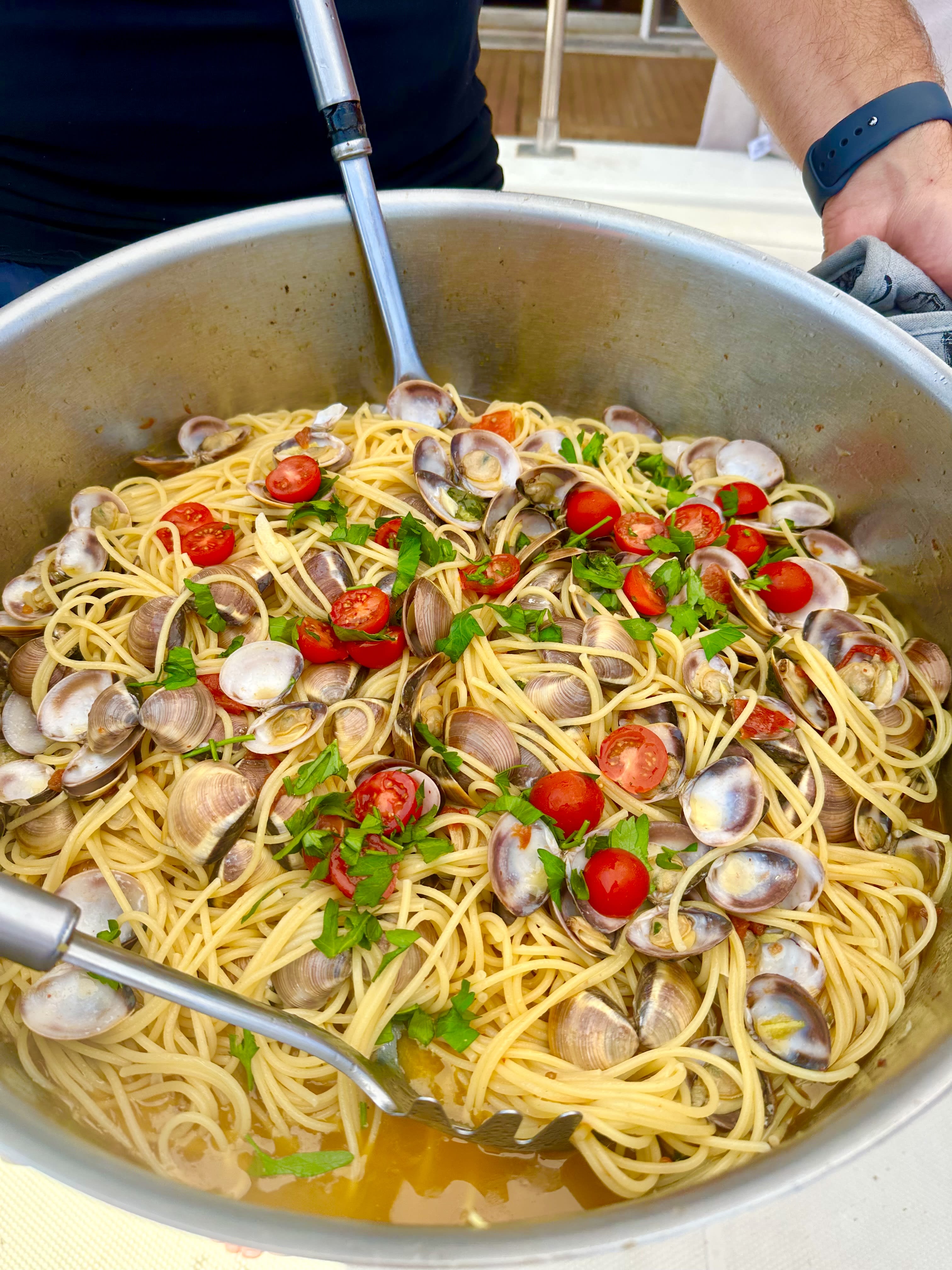 - Dîner préparé par le capitaine : des pâtes aux vongoles (palourdes) selon la recette familiale