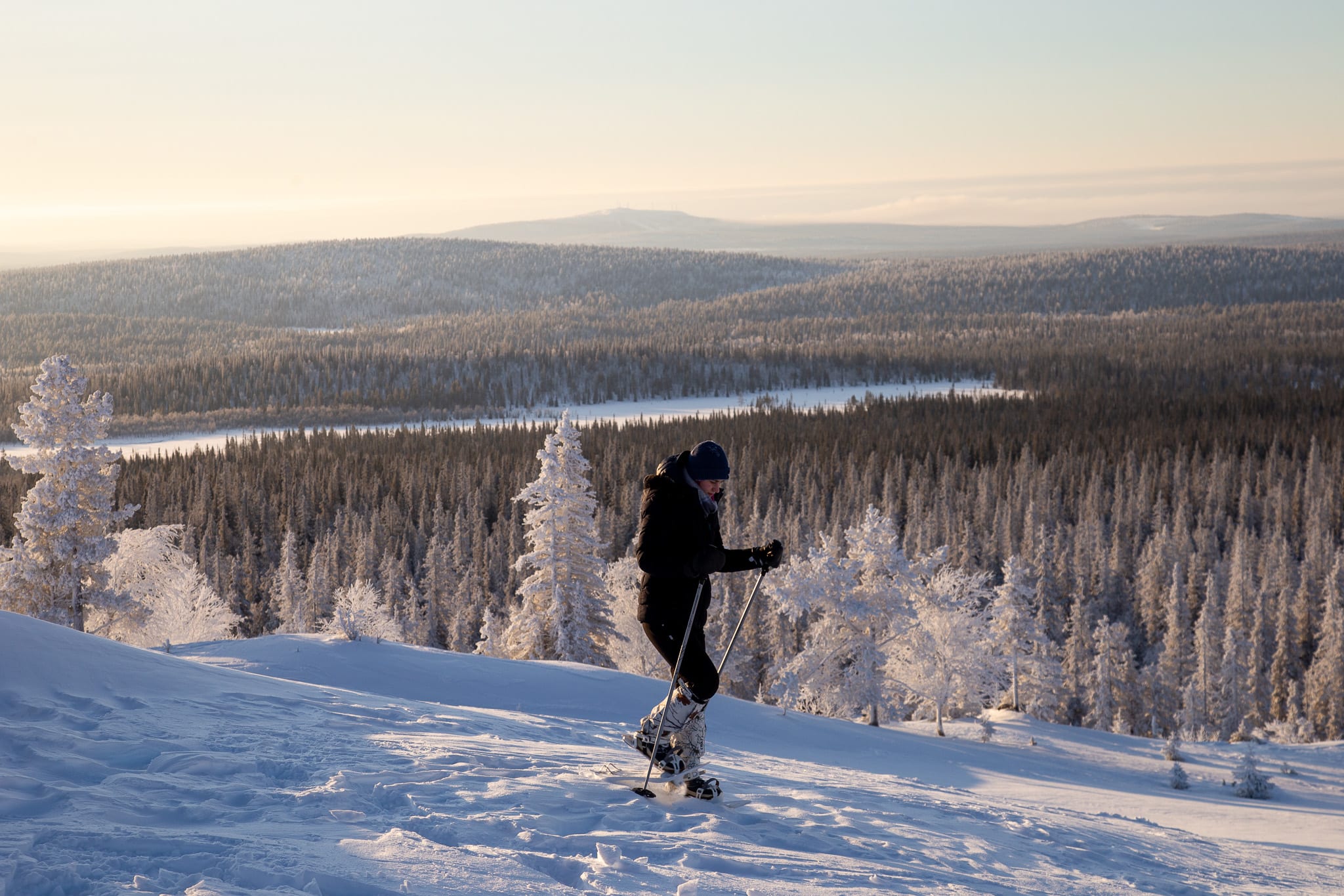 Pour commencer, vous monterez à bord du van à Levi et partirez pour un trajet panoramique de 45 minutes jusqu'au parc. A votre arrivée, vous vous équiperez puis partirez pour votre randonnée en raquettes dans le parc national de Pallas-Ylästunturi, au milieu des plus hautes montagnes de Laponie occidentale. Grâce à des raquettes de haute qualité, vous marcherez dans une neige intacte au milieu de certaines des vallées les plus isolées et les plus désertes du monde. Laissez-vous envelopper par la paix de la faune arctique pendant que vous vous frayez un chemin dans le paysage silencieux, avec pour seule musique le bruit de la neige qui crisse sous vos pieds. Tout au long du trajet, votre guide vous fera découvrir des anecdotes intéressantes sur la nature, la faune et la culture locales, pour une expérience à la fois panoramique et instructive.