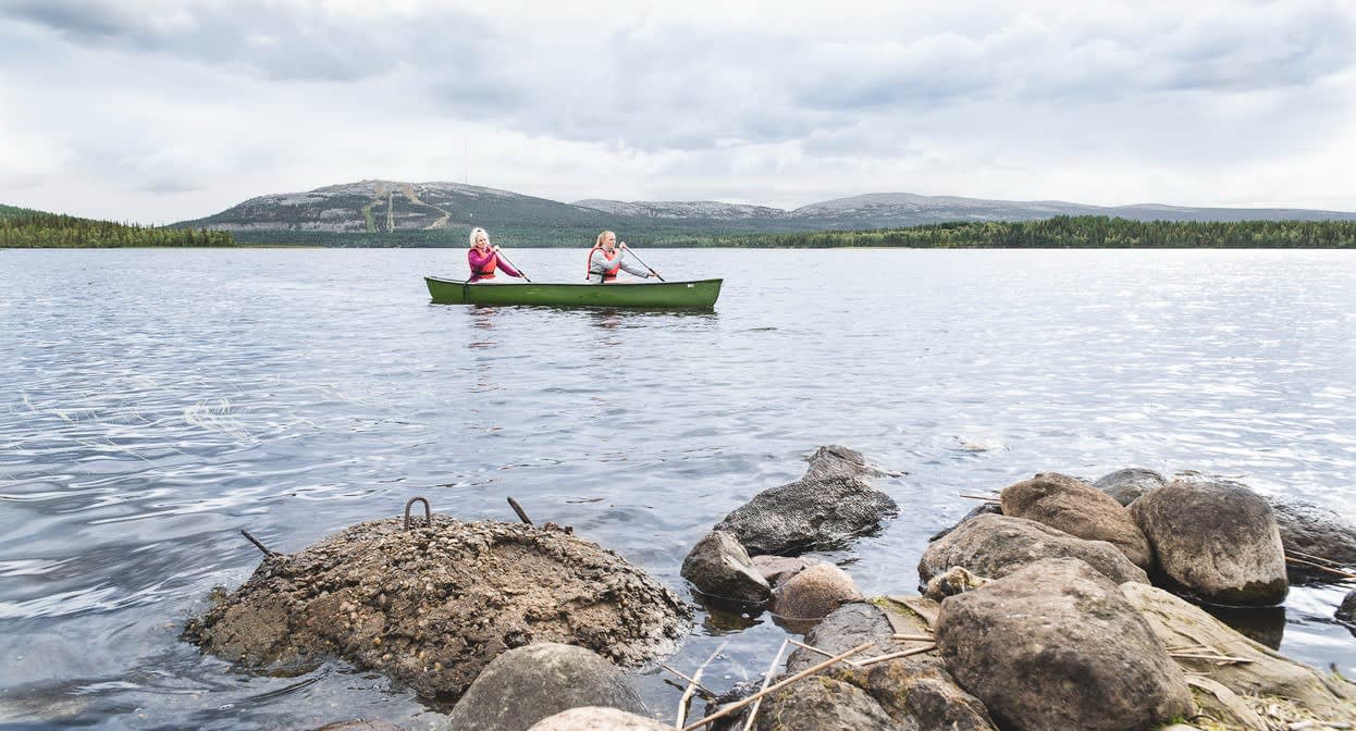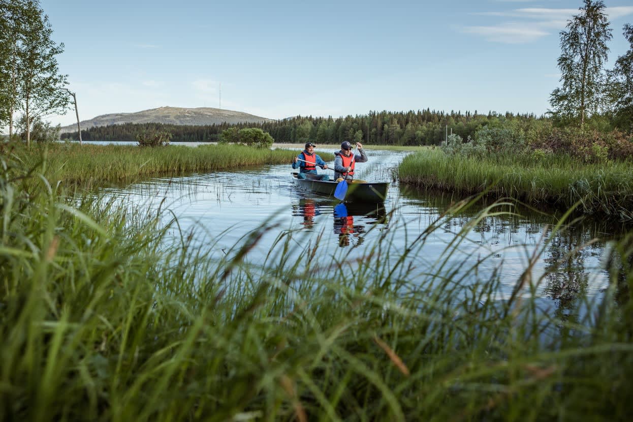 Vous commencerez la journée par une randonnée en VTT de 12 kilomètres autour du lac Pyhäjärvi. Après un parcours sauvage mais bien entretenu, vous suivrez votre guide jusqu'aux rives de la rivière Pyhäjoki, où vous remplacerez les vélos par des canoës. Vous pagayerez à un rythme décontracté sur environ 6 kilomètres au cœur de la Laponie finlandaise. Le moment venu, vous vous arrêterez pour pique-niquer dans un cadre rural, où vous pourrez vous imprégner des vues magnifiques de la Laponie finlandaise et en apprendre davantage sur la faune et la flore locales. À la fin de cette étape, vous descendrez du canoë et vous vous préparerez à marcher environ 7 kilomètres pour atteindre la chute Soutaja (ou un autre chemin pittoresque si ce n'est pas possible). Vous marcherez le long du sentier naturel de Tunturiaapa, en profitant de panoramas intacts sur les sommets les plus méridionaux de la chaîne de montagnes. Enfin, vous atteindrez Naava, où votre transport de retour vous attendra pour vous ramener à Pyhä.