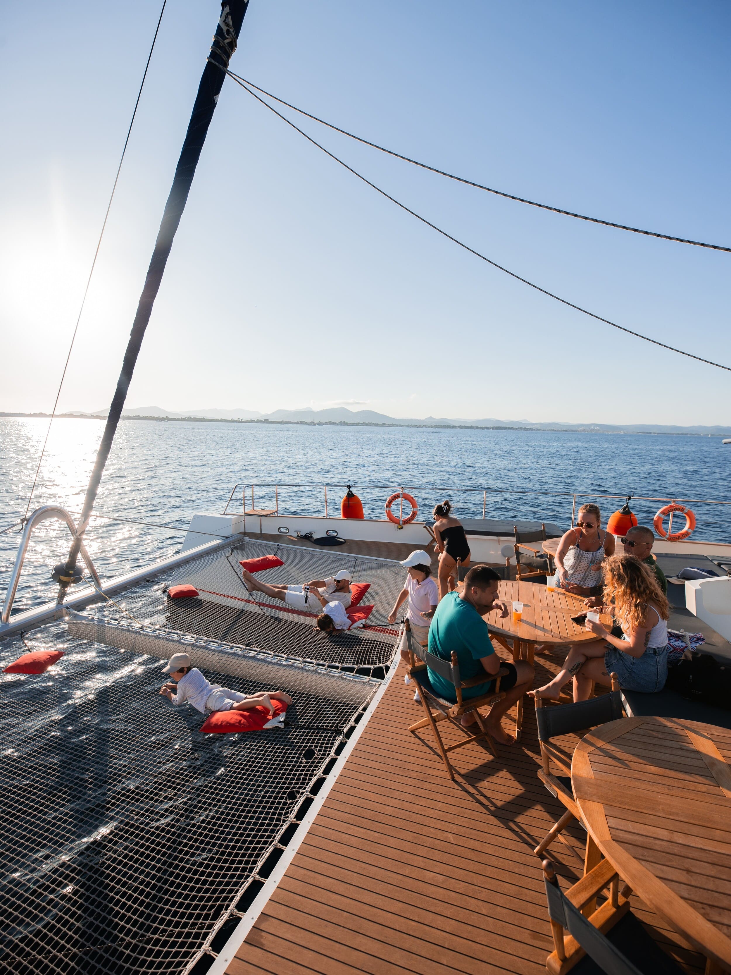 Au départ du port d’Hyères, vous prendrez place à bord d’un catamaran confortable (grands filets et bains de soleil, sanitaires, grand bar, etc.) qui vous fera voyager sur la Méditerranée au rythme paisible des vagues. Deux sorties en catamaran au départ d'Hyères sont disponibles pour cette activité au coucher du soleil :