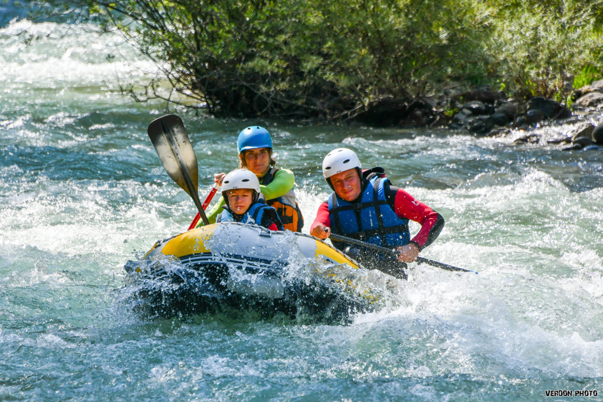 Votre descente en rafting sur le Var à Entrevaux se fera à bord d'un raft de 3 à 8 places, une embarcation gonflable spécialement conçue pour l'eau vive grâce à sa stabilité et sa maniabilité. Tout le matériel nécessaire à la pratique de l'activité et à votre sécurité vous sera fourni (casque, gilet de sauvetage, etc.), sous l'encadrement d'une guide professionnelle qui vous accompagnera tout au long de l'aventure. Véritable passionnée des sports d'eau vive, elle saura vous faire découvrir les plaisirs du rafting sur le Var dans une ambiance chaleureuse et bienveillante. Alors, prêts à naviguer pendant 1h30 à 2h dans le superbe cadre qui entoure la rivière jusqu'au village médiéval d'Entrevaux ?
