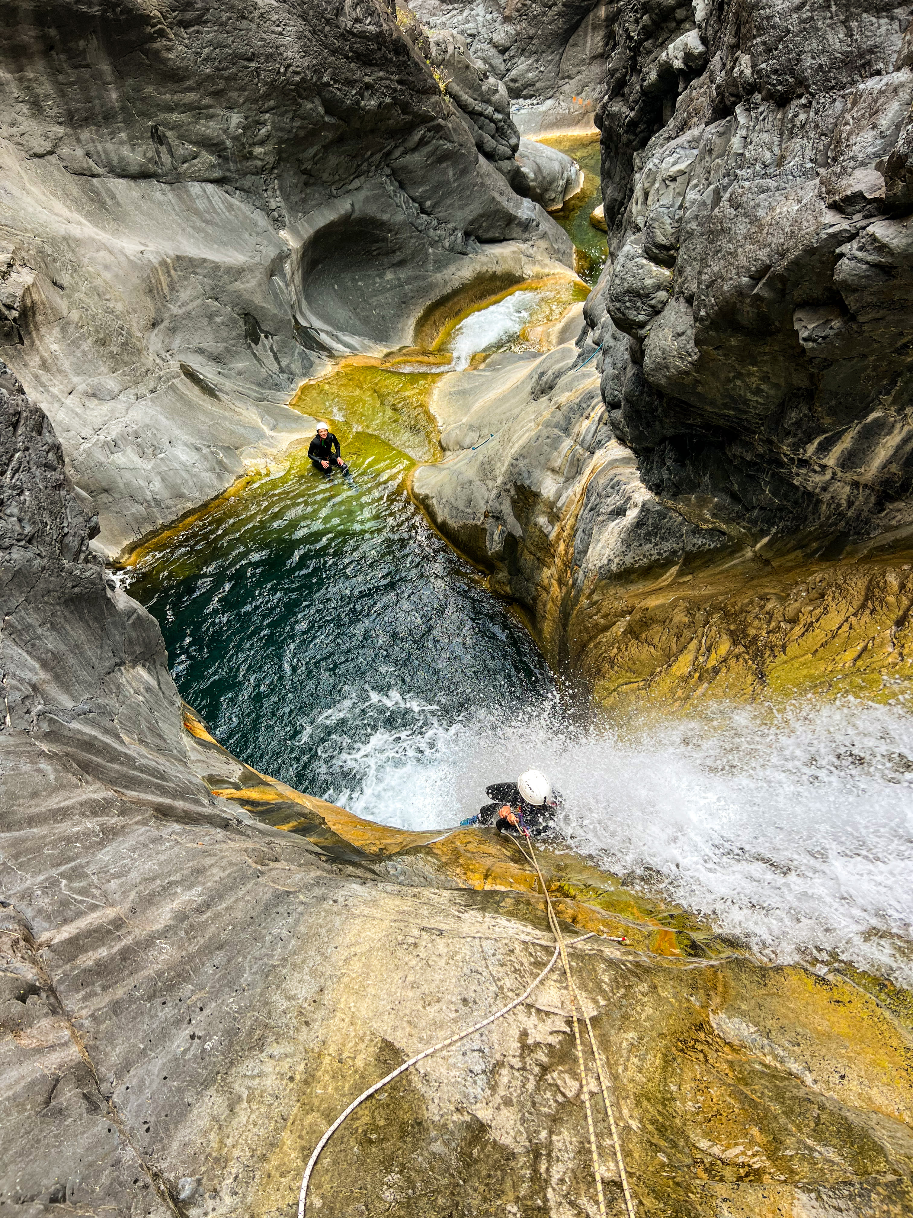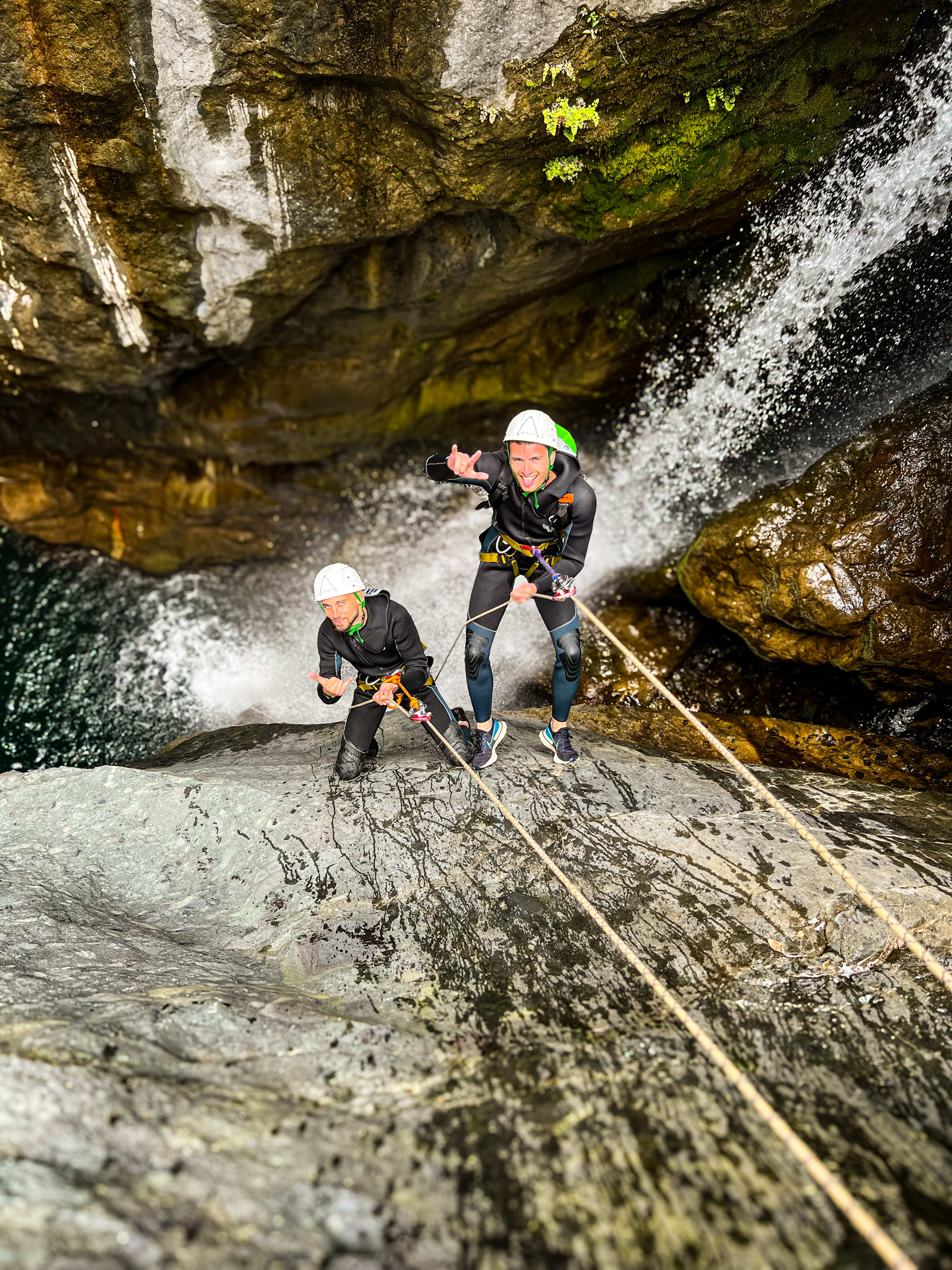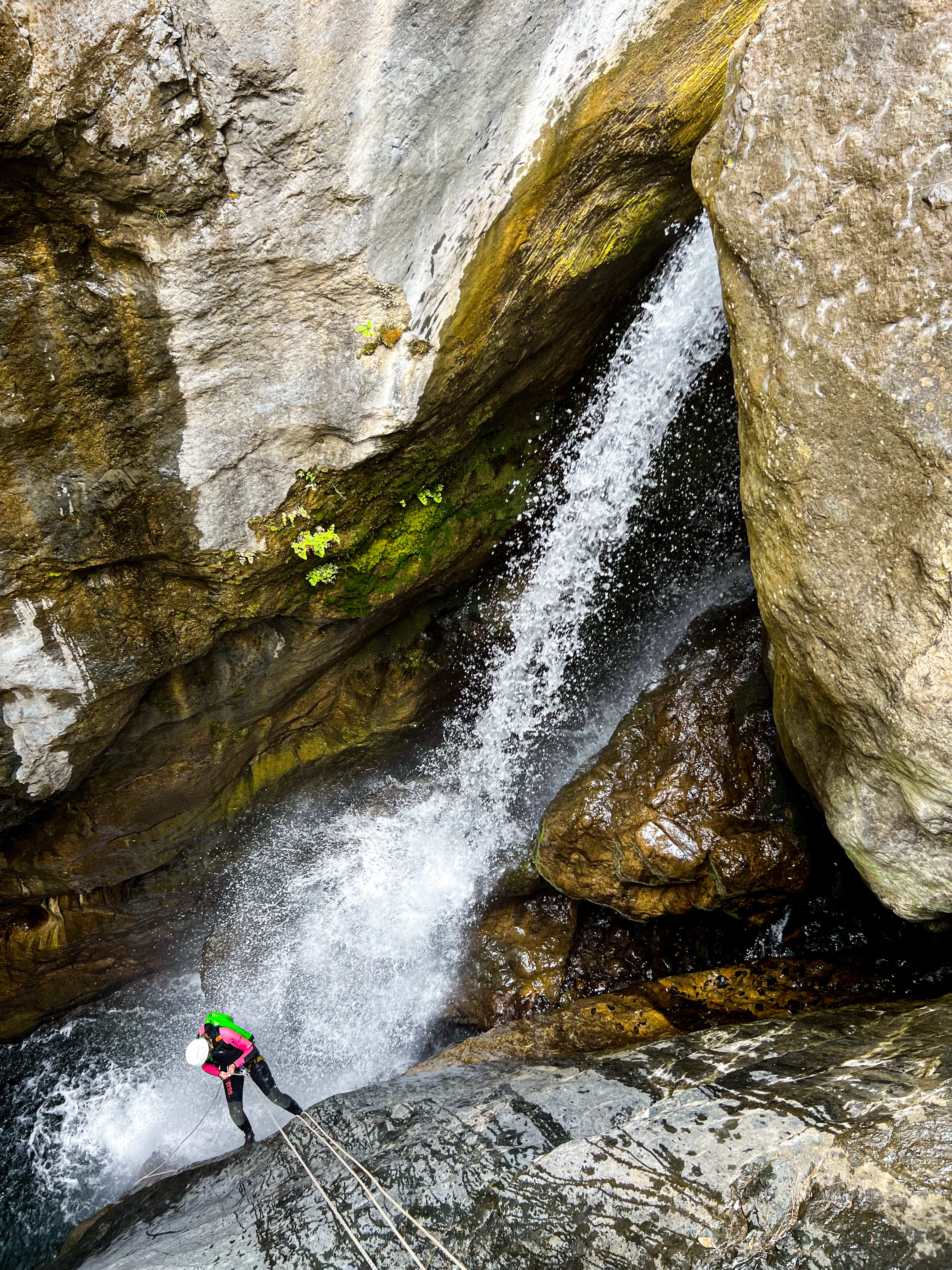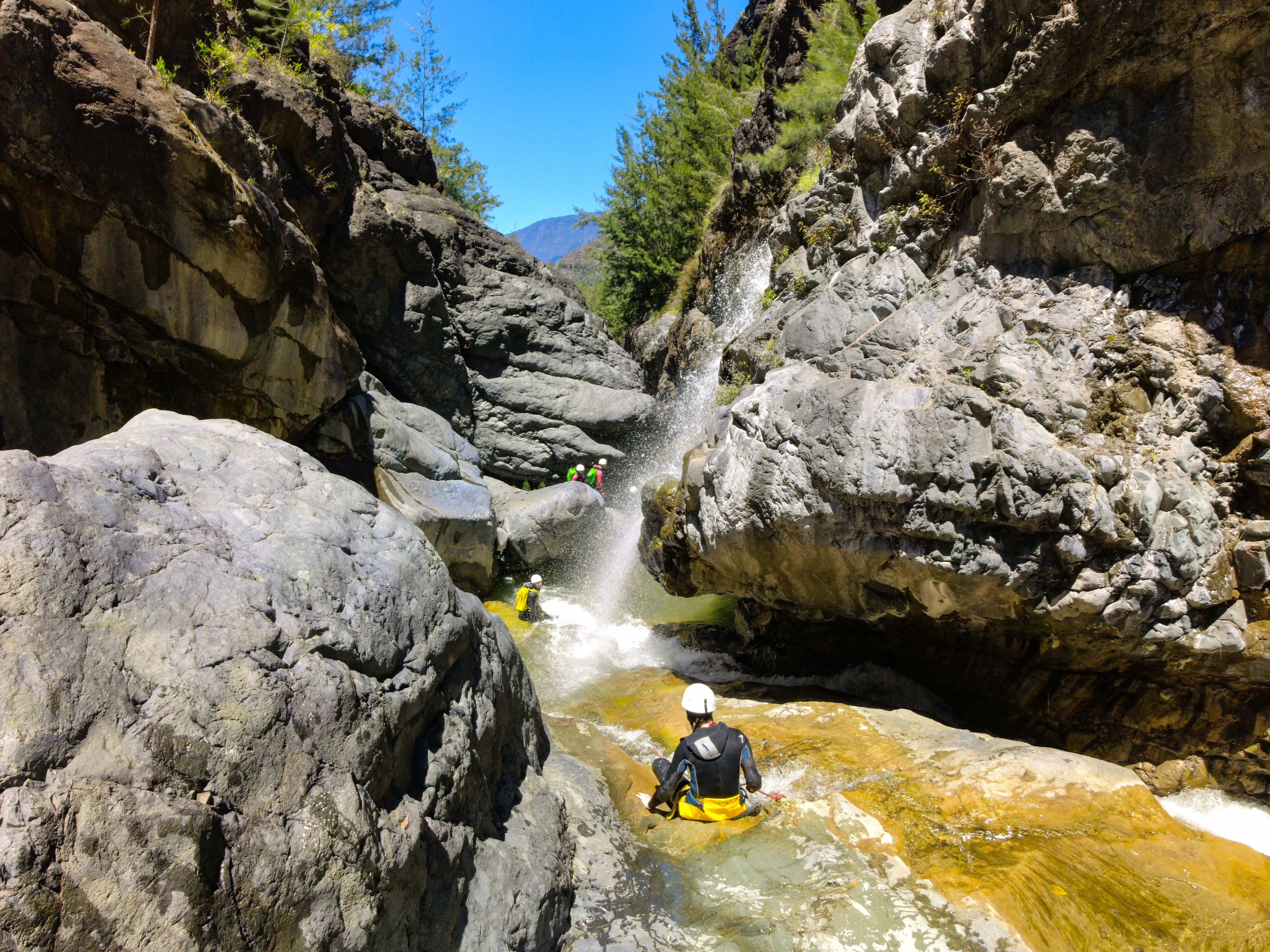 - le parcours Médian (première partie du canyon) - pendant 3h30, vous enchaînerez sauts jusqu'à 6 mètres de haut (tous facultatifs), toboggans naturels et 6 descentes en rappel, dont la première de 20 mètres vous plongera directement dans l'activité, et la deuxième vous offrira un paysage époustouflant sur une cascade haute de 55 mètres percée par les rayons du soleil ;