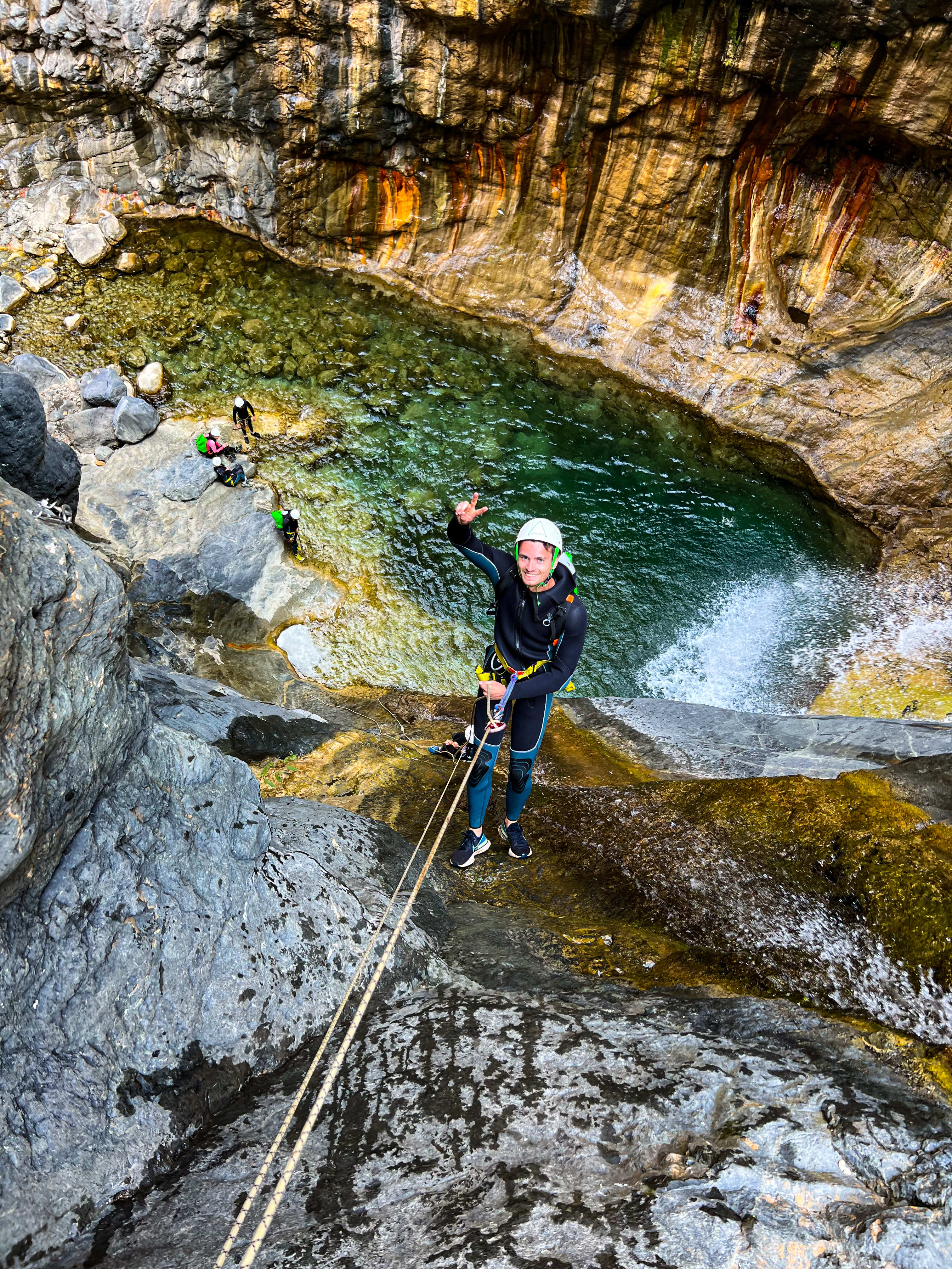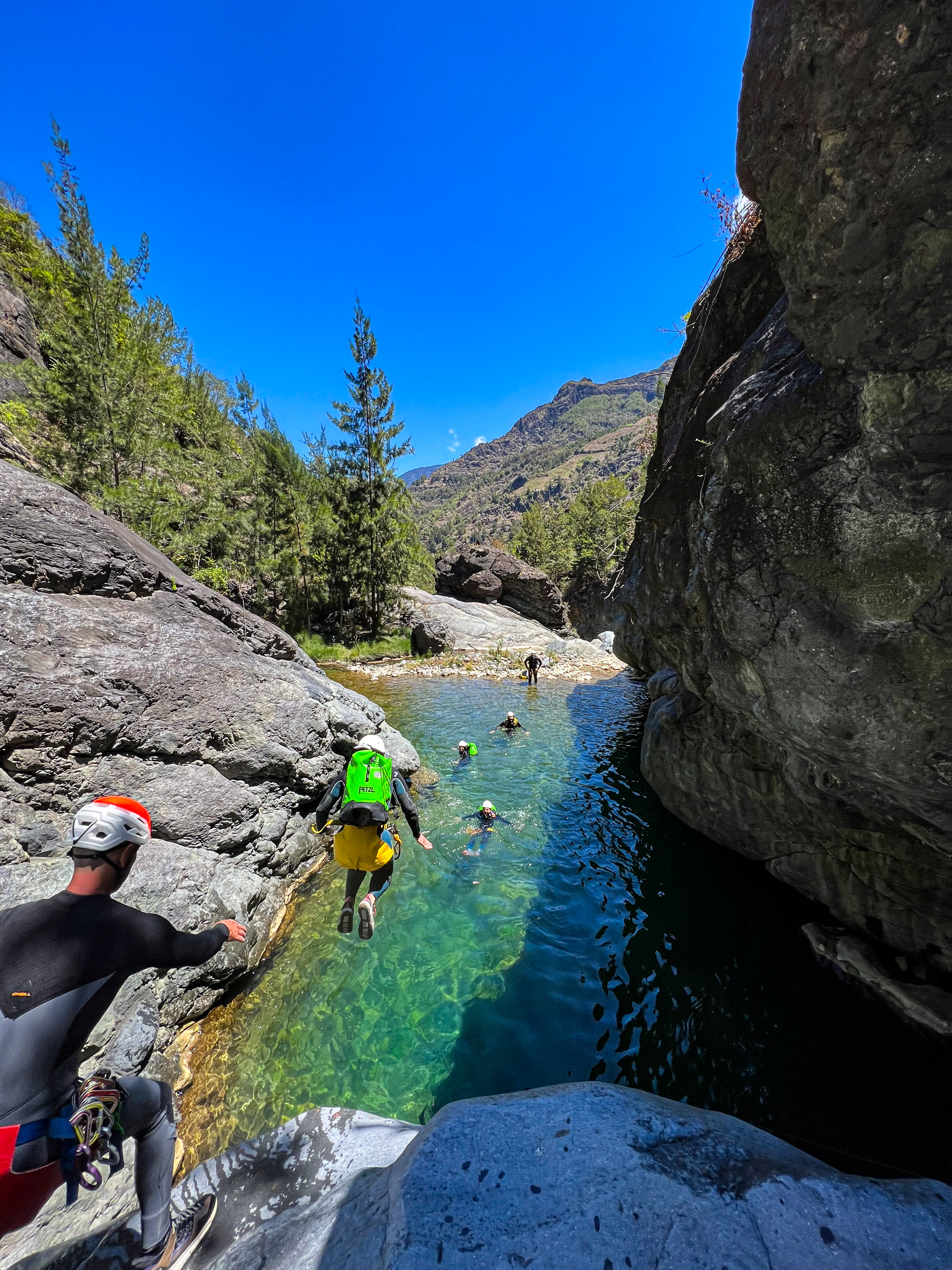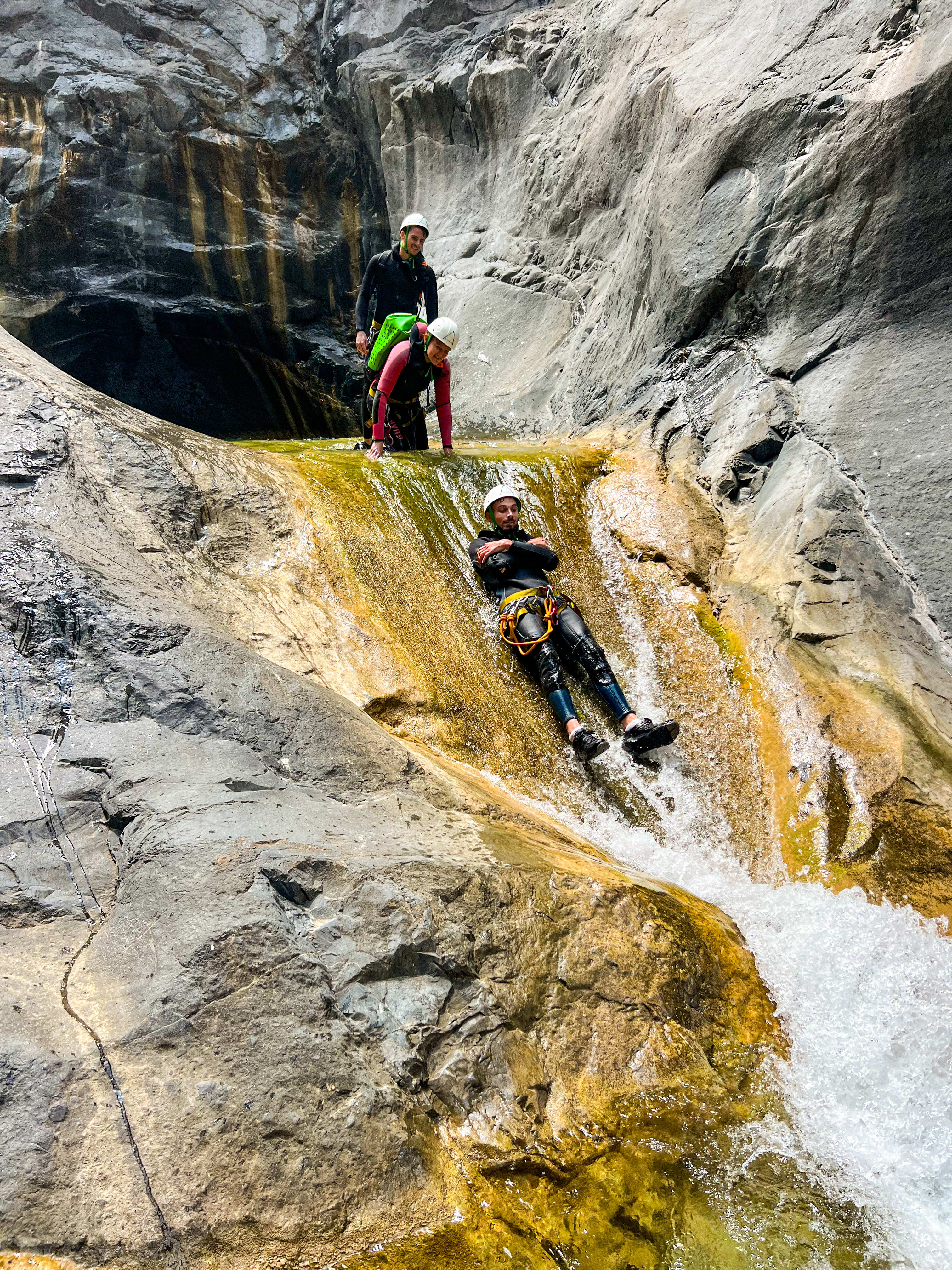 - le parcours Médian (première partie du canyon) - pendant 3h30, vous enchaînerez sauts jusqu'à 6 mètres de haut (tous facultatifs), toboggans naturels et 6 descentes en rappel, dont la première de 20 mètres vous plongera directement dans l'activité, et la deuxième vous offrira un paysage époustouflant sur une cascade haute de 55 mètres percée par les rayons du soleil ;