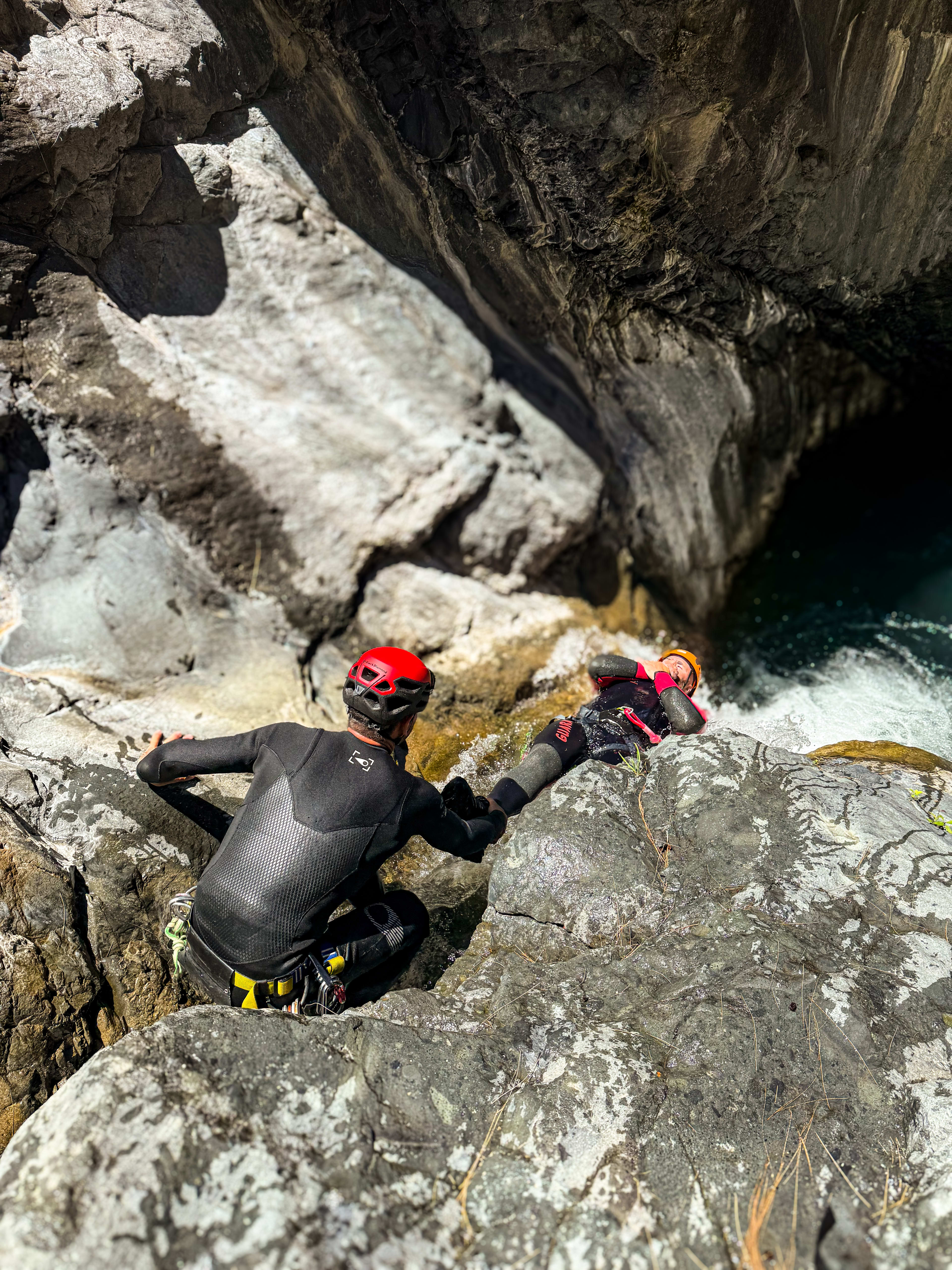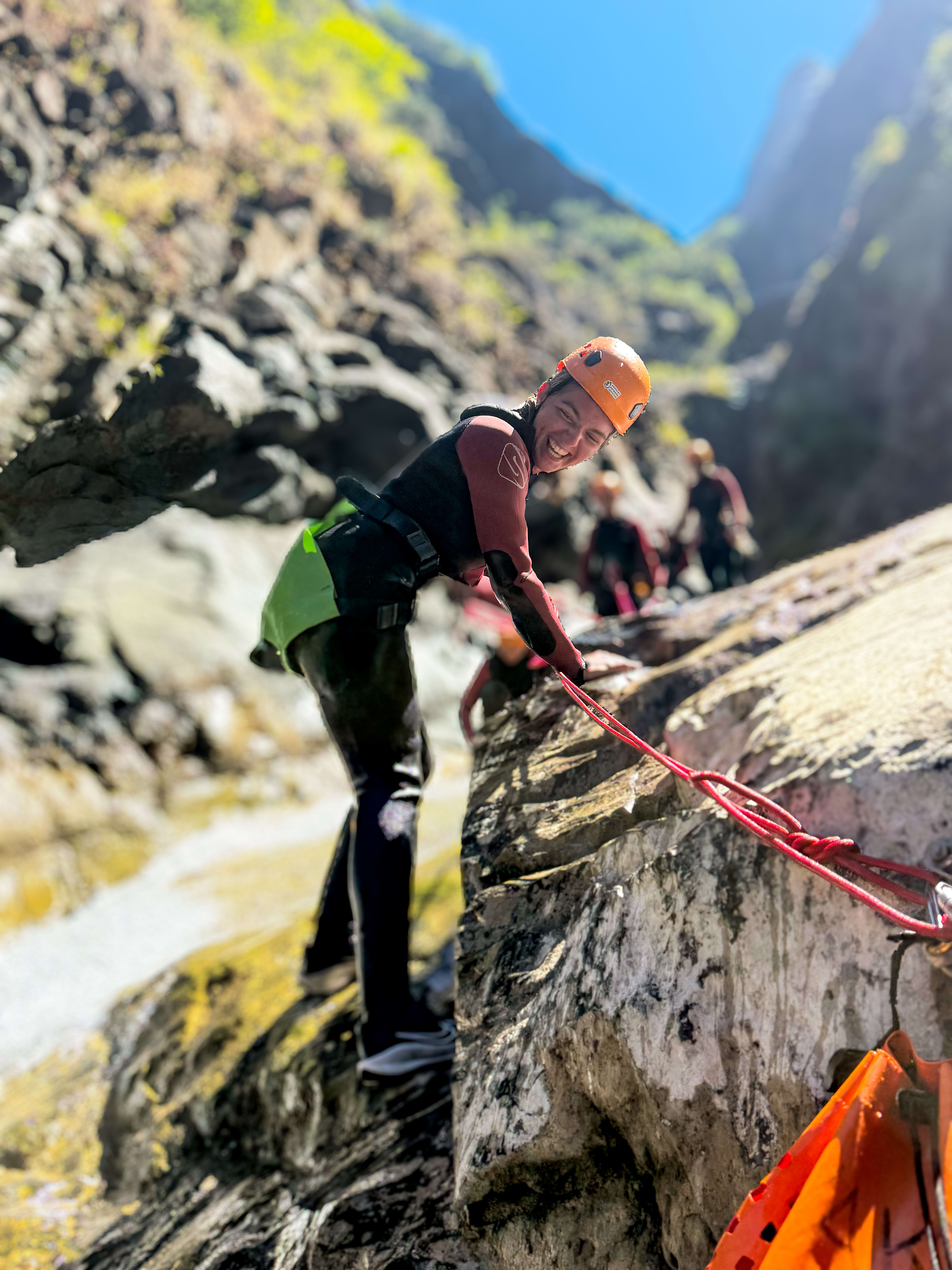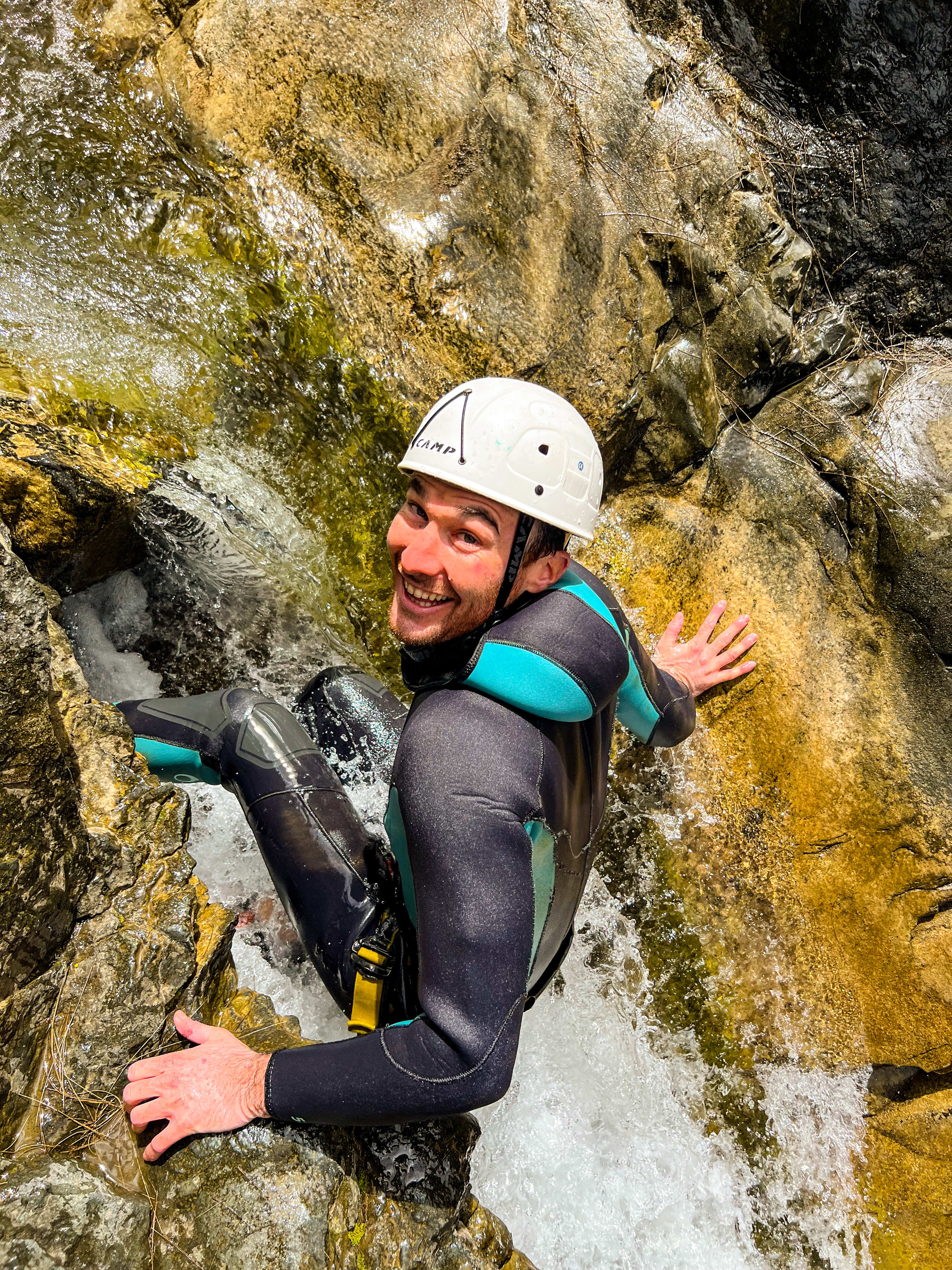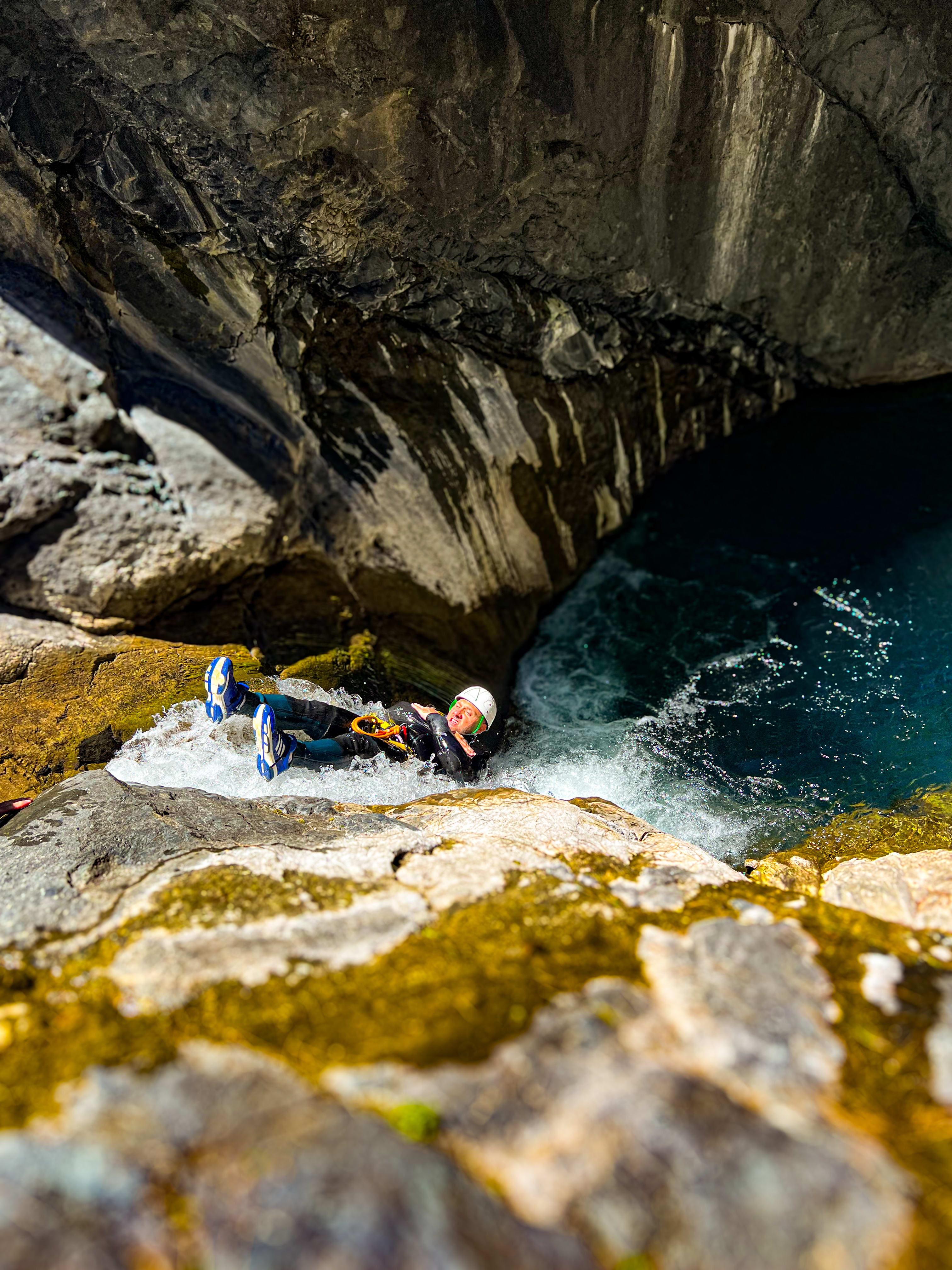 - le parcours Médian (première partie du canyon) - pendant 3h30, vous enchaînerez sauts jusqu'à 6 mètres de haut (tous facultatifs), toboggans naturels et 6 descentes en rappel, dont la première de 20 mètres vous plongera directement dans l'activité, et la deuxième vous offrira un paysage époustouflant sur une cascade haute de 55 mètres percée par les rayons du soleil ;